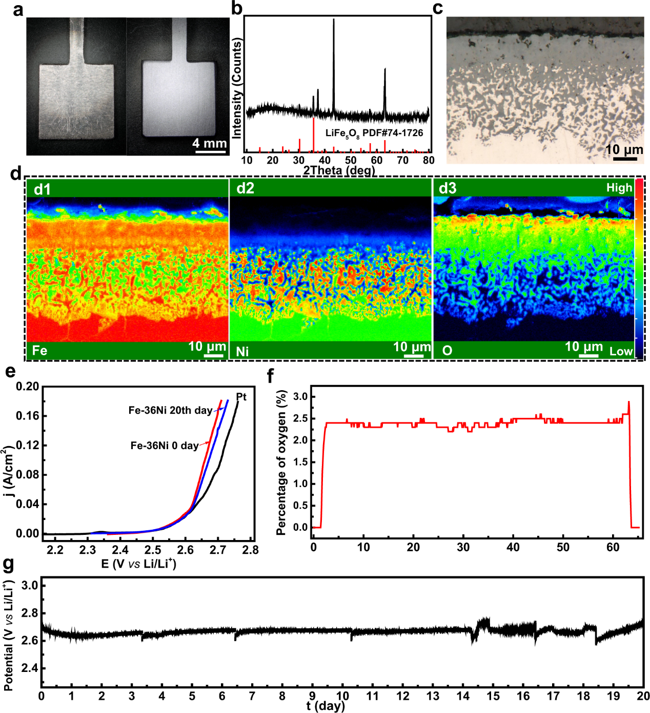 图2. a-d FeNi36阳极的表征分析,e-g FeNi36阳极在LiCl-Li2O电解质体系中的析氧性能及服役稳定性。