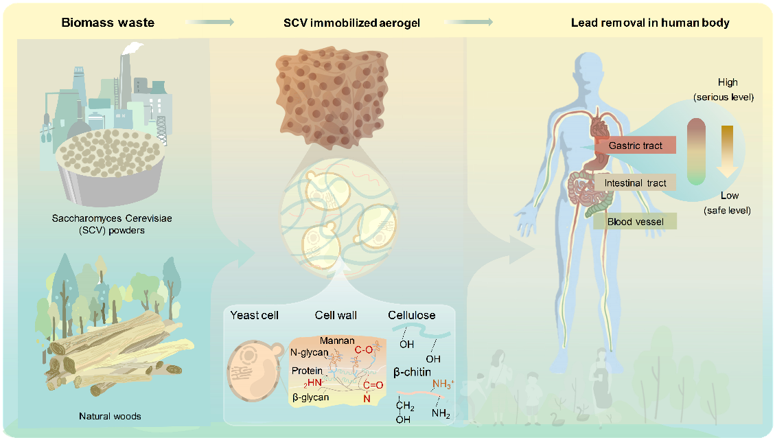 图1. 负载酿酒酵母(生物质废弃物)的再生纤维素纳米纤维气凝胶及其在人体综合除铅中的应用示意图。生物质气凝胶具有多孔的微结构和丰富的官能团,在人体胃肠道和血液中表现出良好的综合除铅性能。