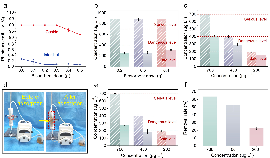 图3. SCV-n气凝胶在人体环境中的应用。(a-b) Pb2+在胃、肠期的生物可及性及吸附能力结果图。(c)血清静态吸附结果图。(d)血清动态吸附装置示意图。(e-f)血清中Pb2+的生物可及性和去除率结果图。