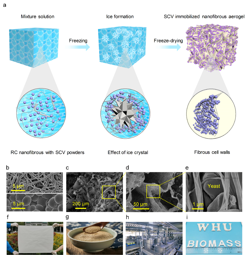 该工作采用的酿酒酵母(SCV)来自发酵工业,如啤酒酿造废弃物,再生纳米纤维来自废木材粉末,生物质原料具备的低成本和大批量特性确保了大量患者低成本、可扩展的生产潜力以及良好的环境可持续性。更重要的是,该纳米纤维气凝胶的制备不引入任何交联剂,从而避免了有毒物质的添加。