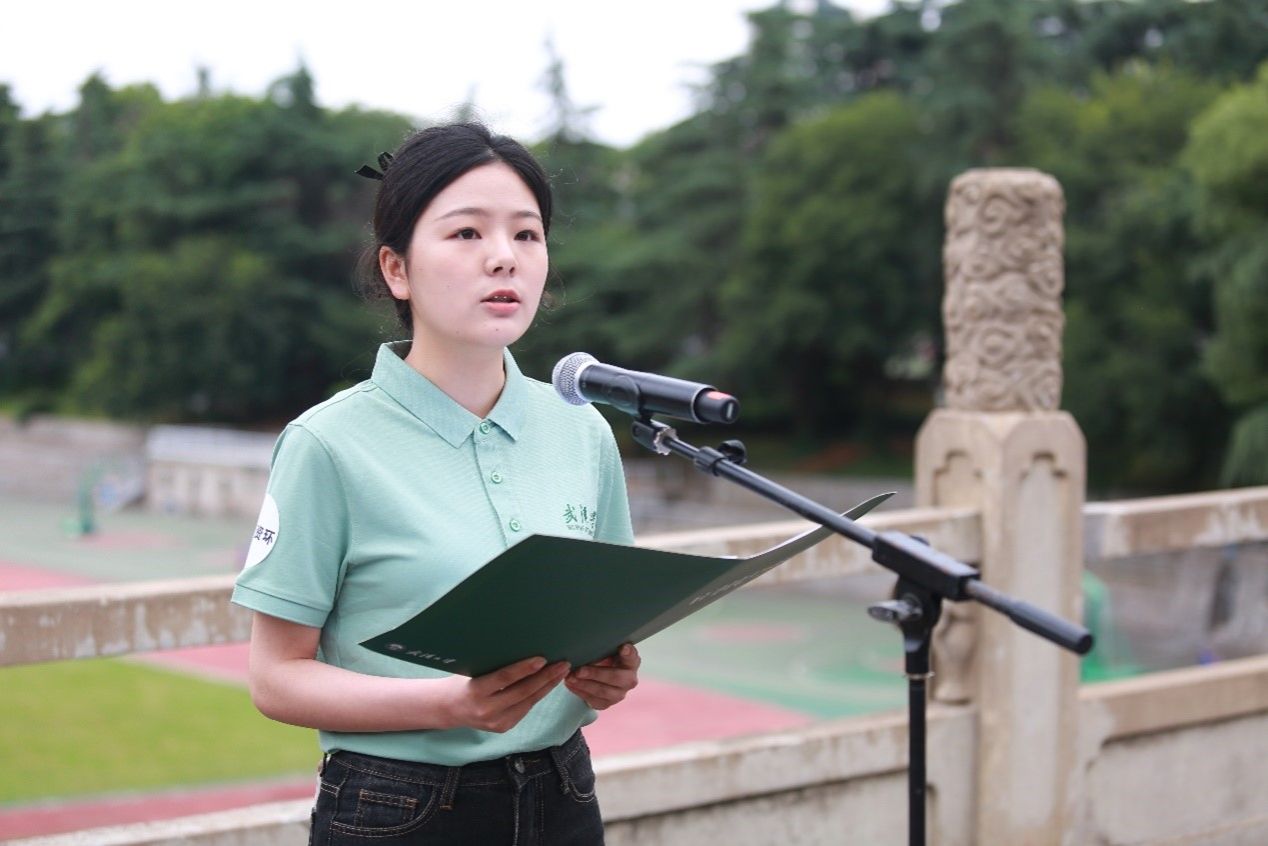 郝梦媛(学院2021级硕士研究生):今天是世界环境日,作为澳门美高梅 的研究生,我深知生态兴则文明兴的道理。今日,我们在珞珈山上升起国旗,唱响校歌,吟诵诗篇,在我们心中播下一颗绿色的种子,用我们真诚的心去感动人们,用我们的力量去呵护可持续发展社会,用行动去捍卫我们赖以生存的家园,明天,我们才能收获一片碧水青山,实现生态保护、绿色发展、民生改善相统一的美好未来!