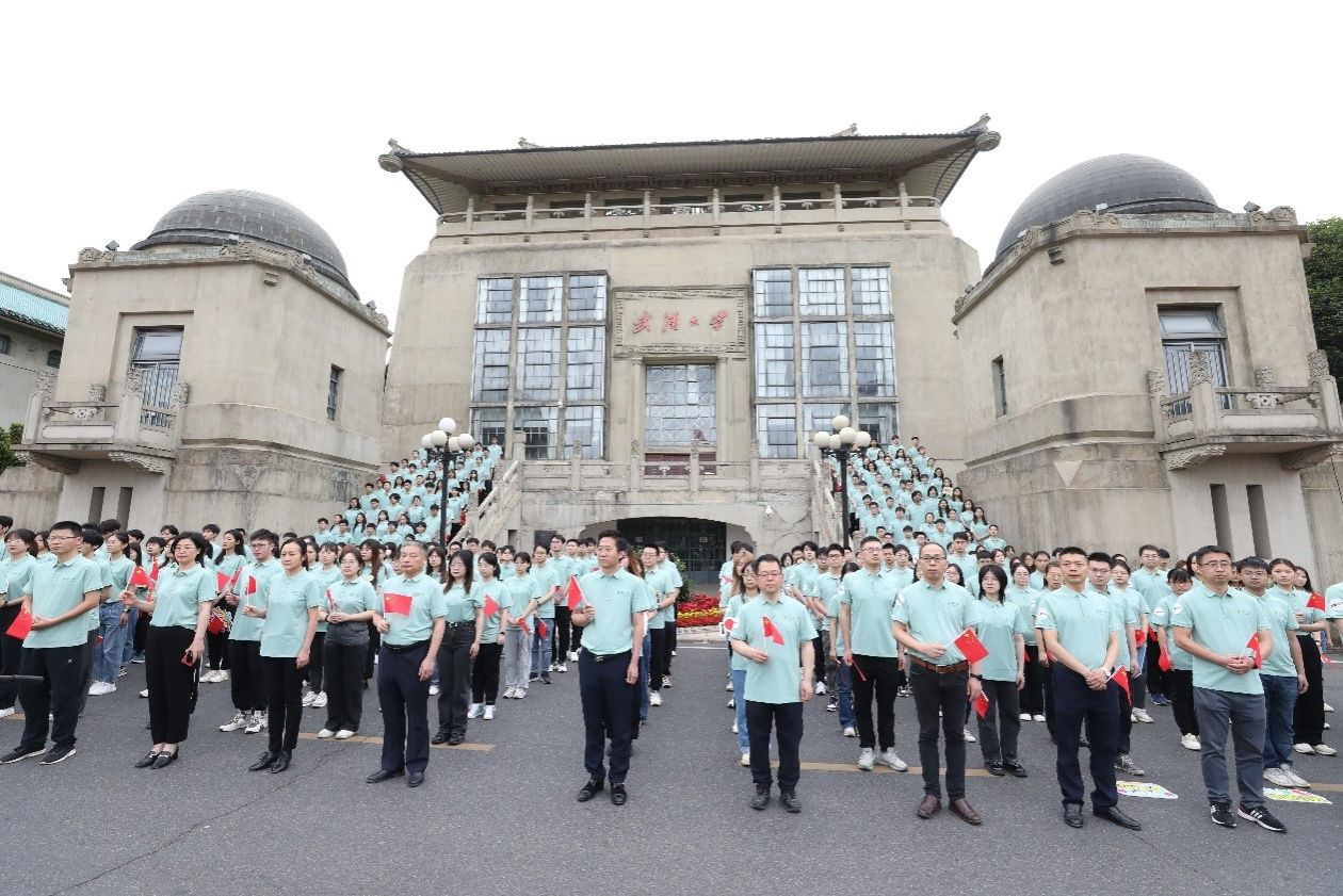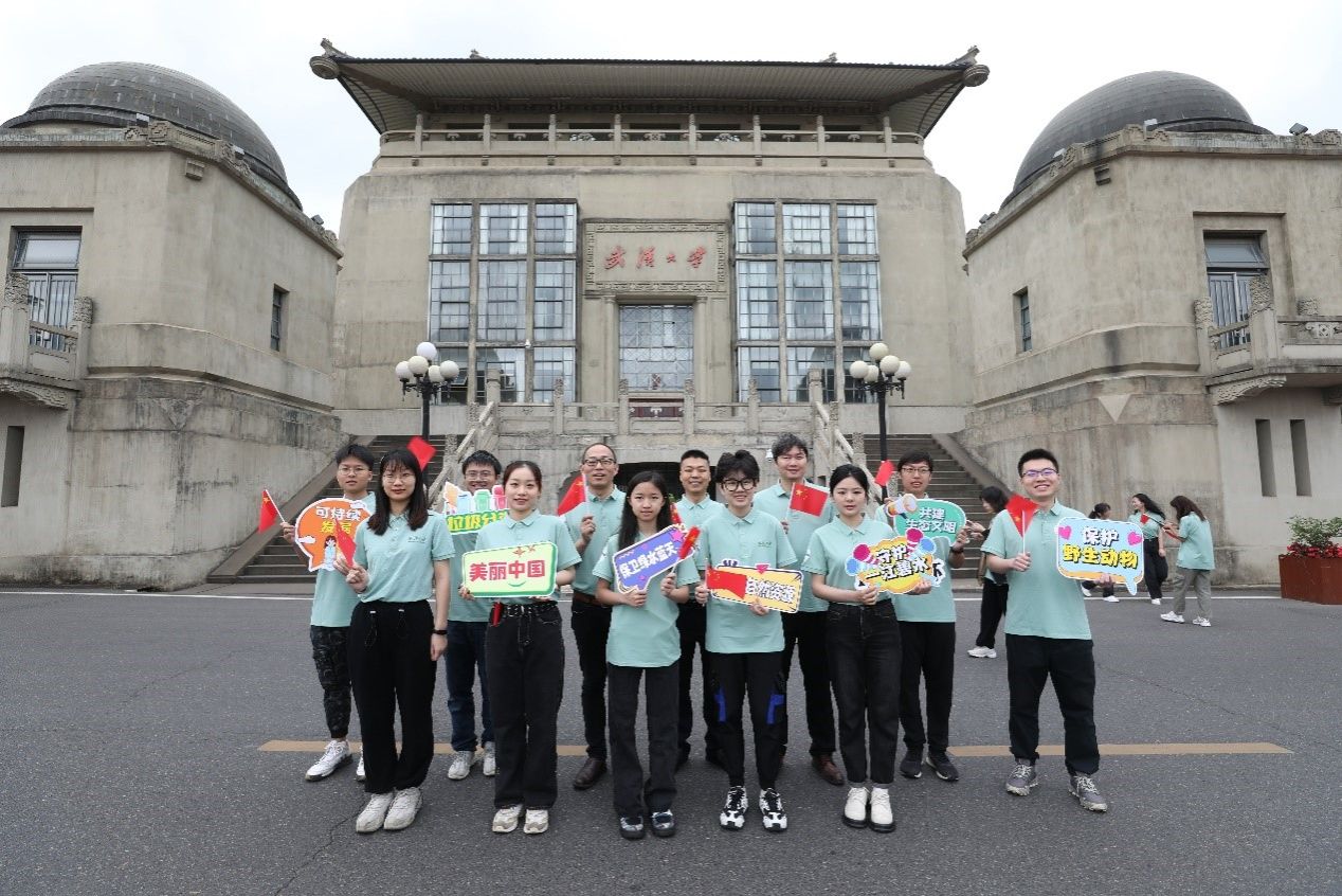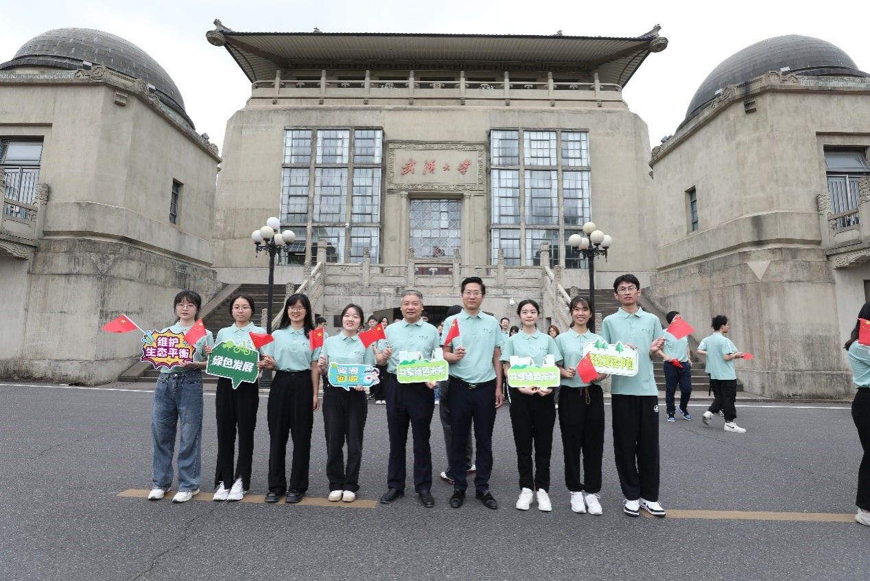 “东湖之滨,珞珈山上,这是我们亲爱的学堂...”活动最后,全体师生齐唱校歌,展现出昂扬向上、积极进取的精神风貌。活动结束后,师生们在行政楼前手持环保主题的小标语牌合影,纪念这次有意义的活动。