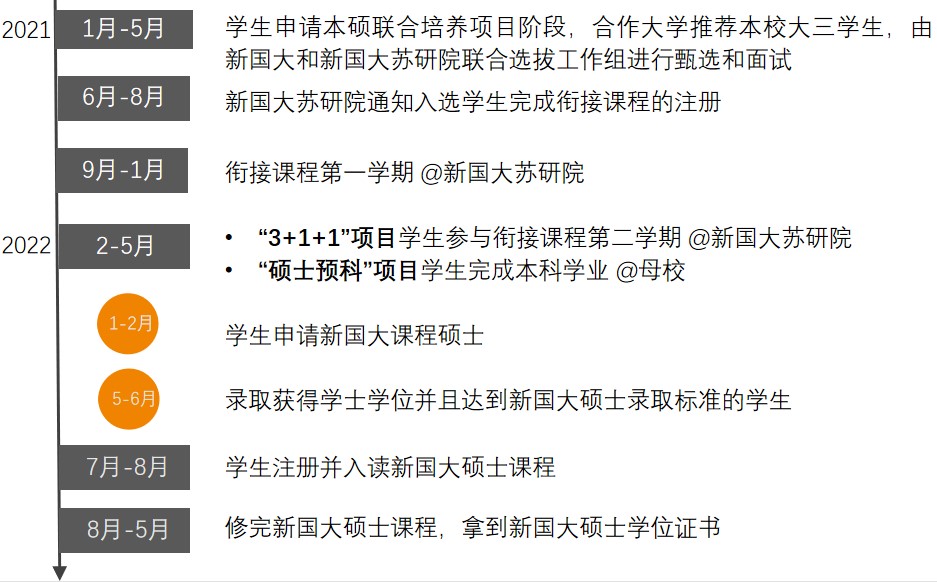 “3+1+1”项目针对武大资环学院相关专业优秀的本科学生,制定了3年国内大学本科,1年衔接课程和1年硕士课程的学习模式。武大资环学院学生在完成学院相关专业前三年本科学习后,可申请新国大苏研院一年制衔接课程,衔接课程完成并同时满足武大毕业要求并顺利毕业后,可申请新国大土木与环境工程系一年制课程硕士。
