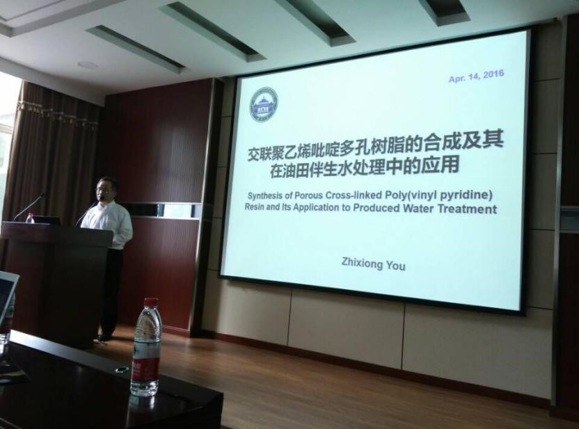张万顺教授主要讲了流域环境风险预警研究。他从水污染的现状与损失、风险预警及其系统发展、模型技术体系和实例以及未来模型技术的发展趋势为我们讲解了这种模型技术。游志雄教授在日本深造了十余年,他主要讲述了如何用聚乙烯吡啶多孔树脂将水油混合物中的油富集起来,这也是他在日本做的主要工作之一。游老师从树脂的合成、树脂在实验室中的应用到最后投入到工业生产中为大家详细讲述了他的研究工作。邓红兵副教授在开讲前首先拿出一个静电纺丝仪为大家讲述静电纺丝是如何工作的,将大家的兴趣瞬间吸引,紧接着他讲解了静电纺丝的原理以及在染料敏化太阳能电池和负载粮酒酵母的多层夹心状纳米纤维膜用于去除低浓度高毒性重金属中的应用。在提问环节,同学们对于自己感兴趣的研究方向进行了提问,老师们也耐心解答了同学们的问题,博得了同学的阵阵掌声。