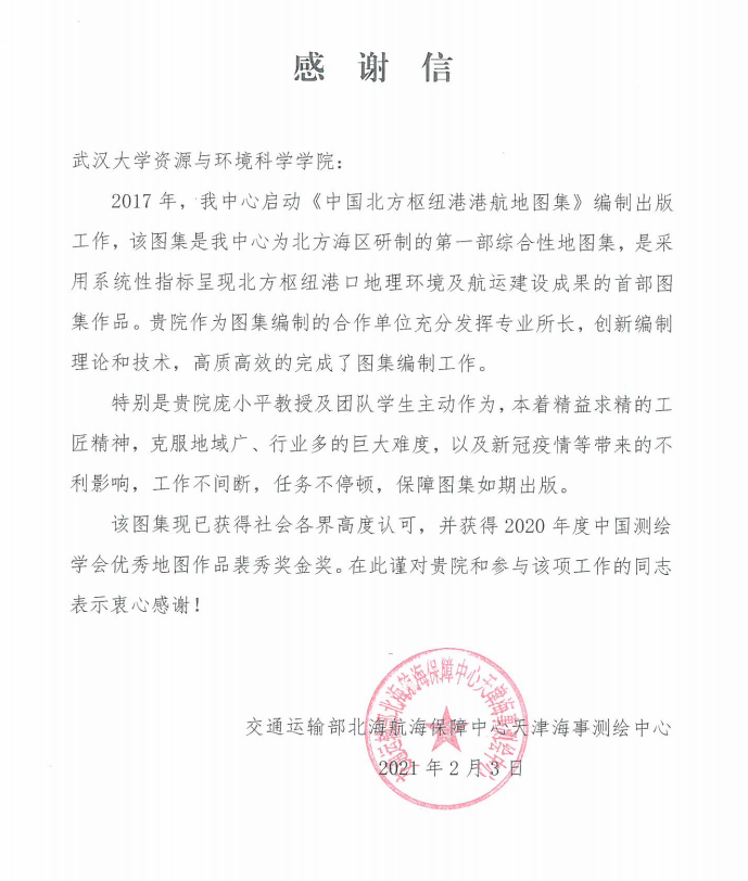 天津海事测绘中心来函:感谢庞小平教授团队提供技术支持