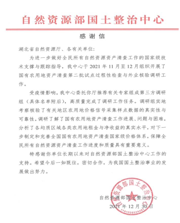 自然资源部国土整治中心来函:感谢澳门美高梅 张雅杰副教授等湖北省调研组专家高质量完成国有农用地资产清查等调研工作任务