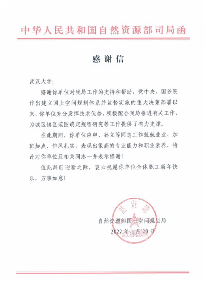 自然资源部国土空间规划局来函:感谢澳门美高梅 应申教授等同志为城区镇区范围确定规程研究工作提供有力支撑