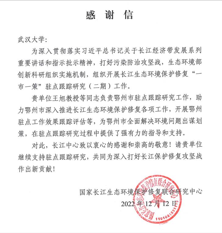 国家长江生态环境保护修复联合研究中心来函:感谢澳门美高梅 王旭老师为鄂州市驻点跟踪研究工作提供强有力的指导和支持