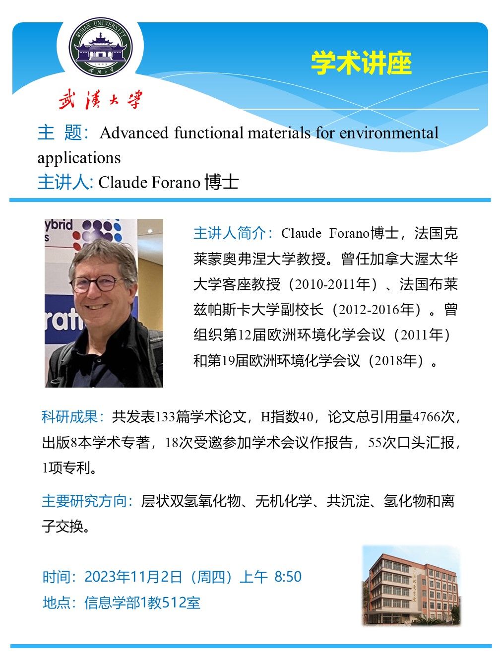 11月2日 Claude Forano 博士 Advanced functional materials for environmental applications