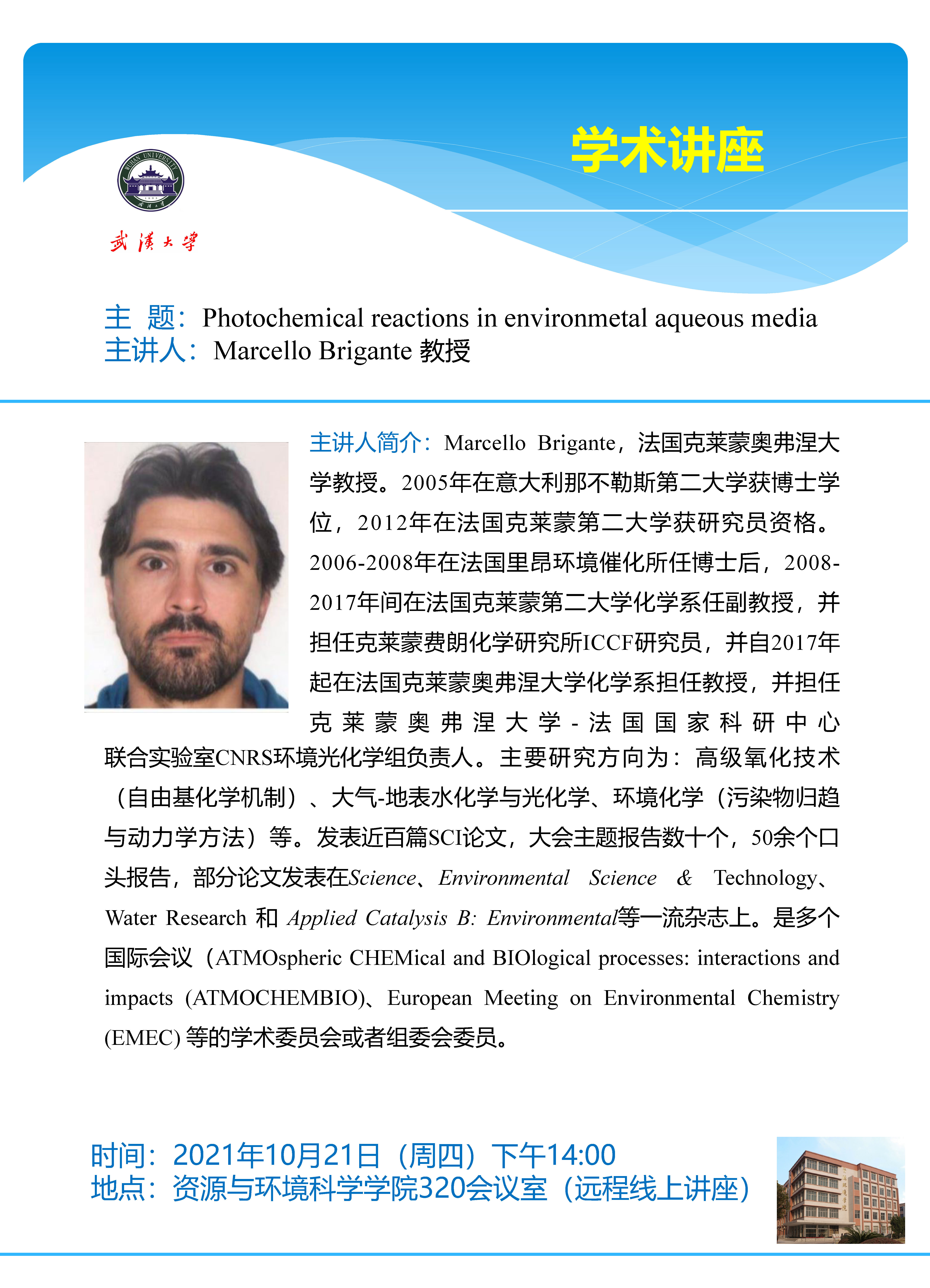 10月21日下午法国克莱蒙奥佛涅大学Marcello Brigante教授:Photochemical reactions in environmental aqueous media