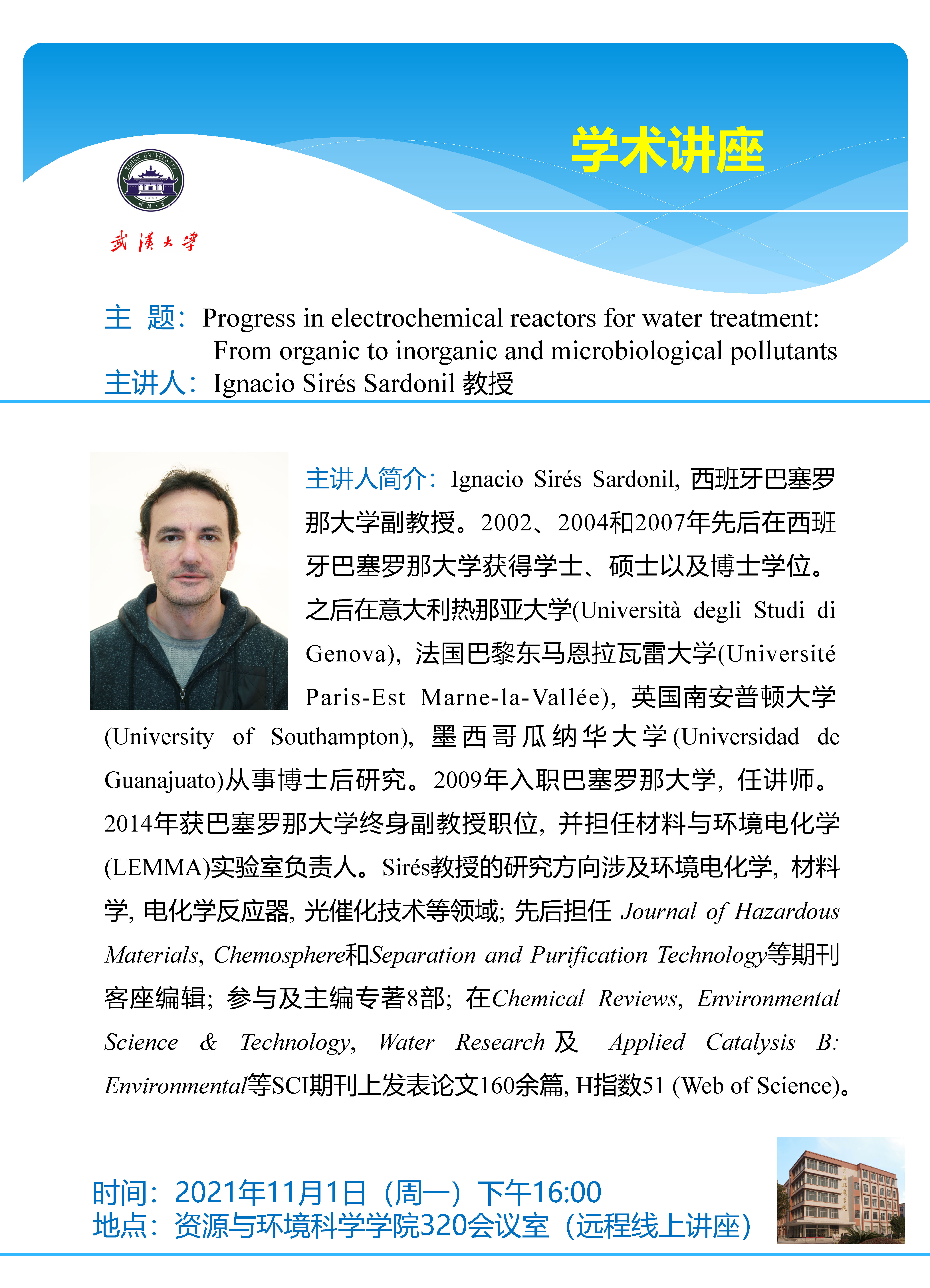 11月1日下午西班牙巴塞罗那大学Ignacio Sirés Sardonil 副教授:Progress in electrochemical reactors for water treatment:From organic to inorganic and microbiological pollutants
