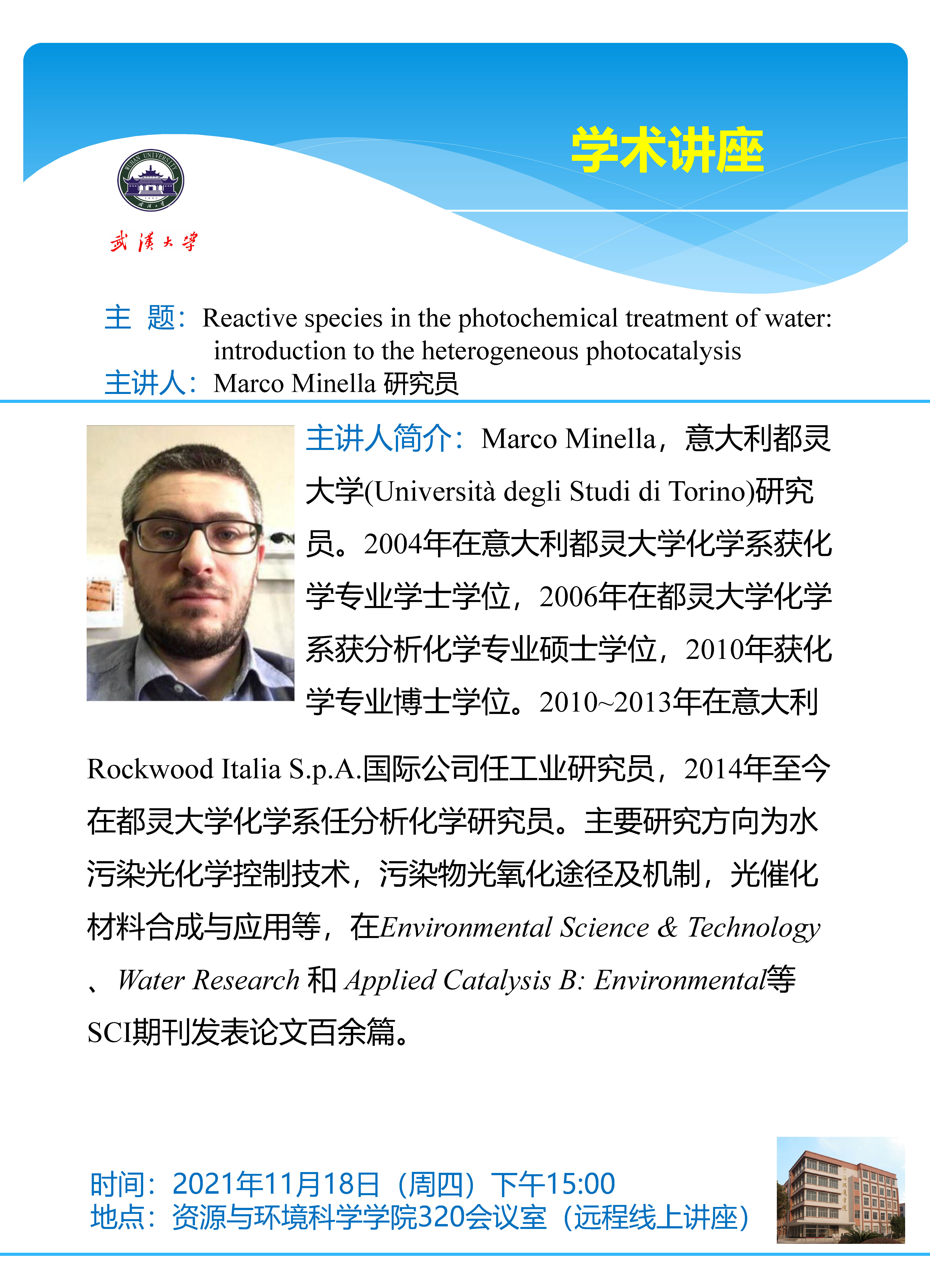11月18日下午意大利都灵大学Marco Minella研究员:Reactive species in the photochemical treatment of water: introduction to the heterogeneous photocatalysis