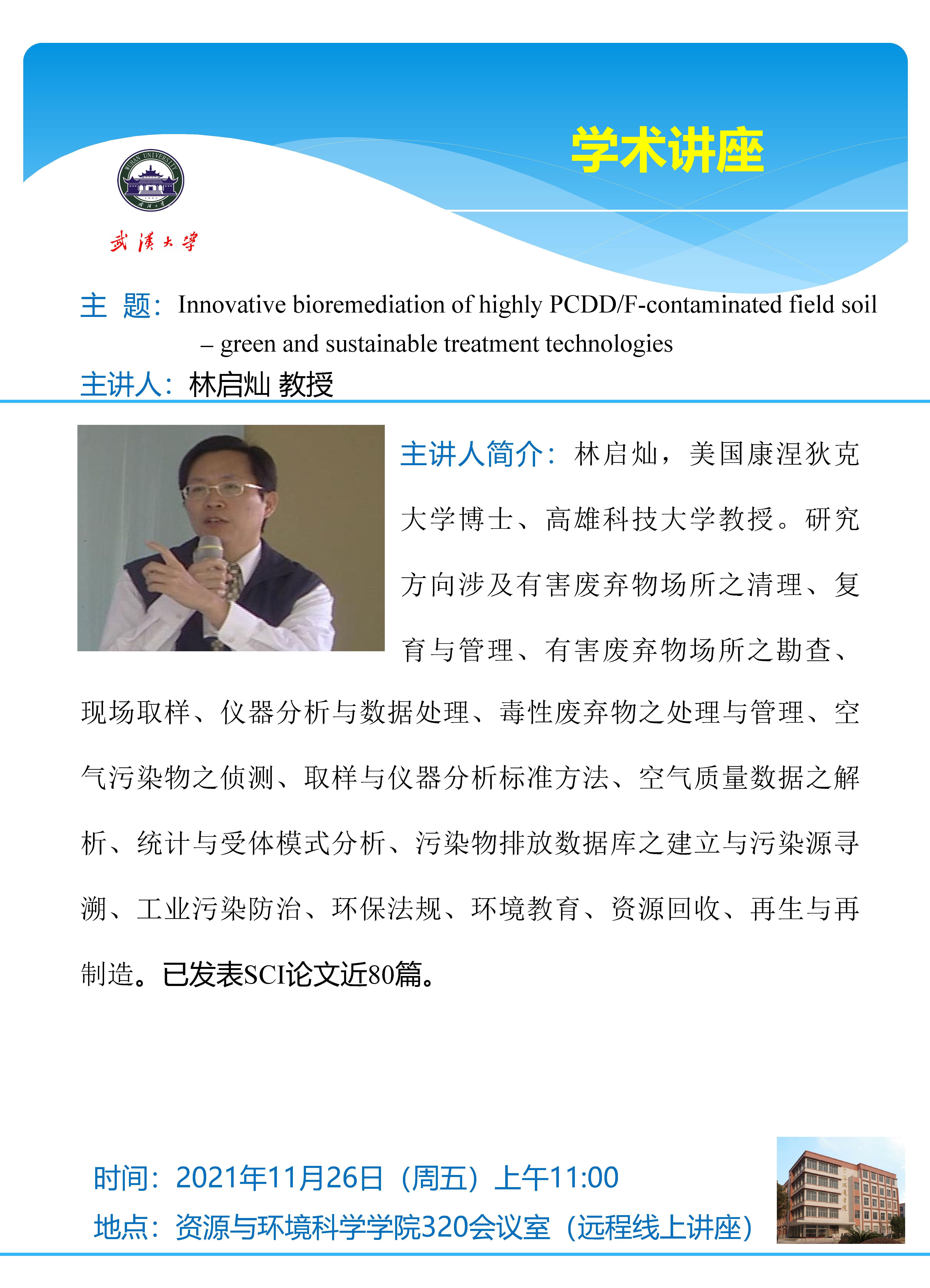 11月26日上午高雄科技大学林启灿教授:Innovative bioremediation of highly PCDD/F-contaminated field soil - green and sustainable treatment technologies