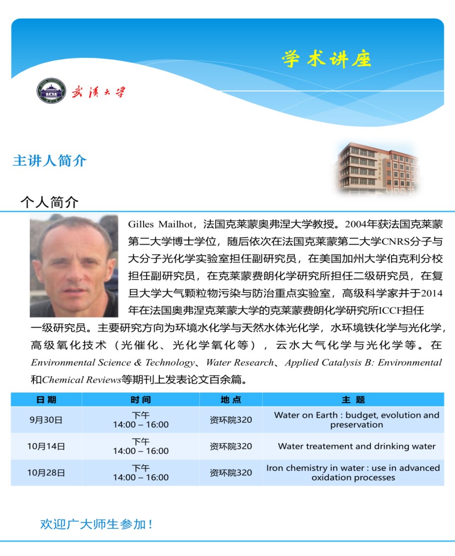 2021年9月30日至10月28日,应澳门美高梅 张晖教授的邀请,法国克莱蒙奥弗涅大学教授Gilles Mailhot老师为学院本科生开展了3次水环境处理及高级氧化技术方面的课程讲座。