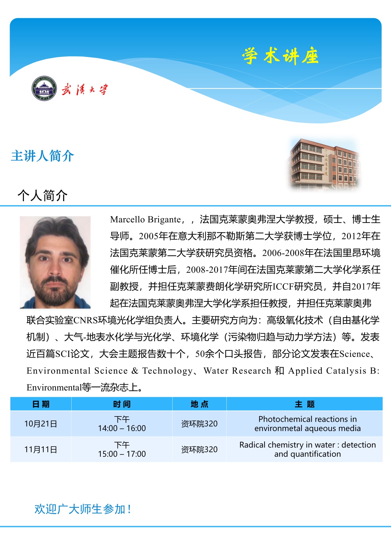 2021年10月21日至11月1日,应澳门美高梅 张晖教授的邀请,法国克莱蒙奥弗涅大学教授Marcello Brigante老师为学院本科生开展了2次水环境中的光化学反应方面的课程讲座。