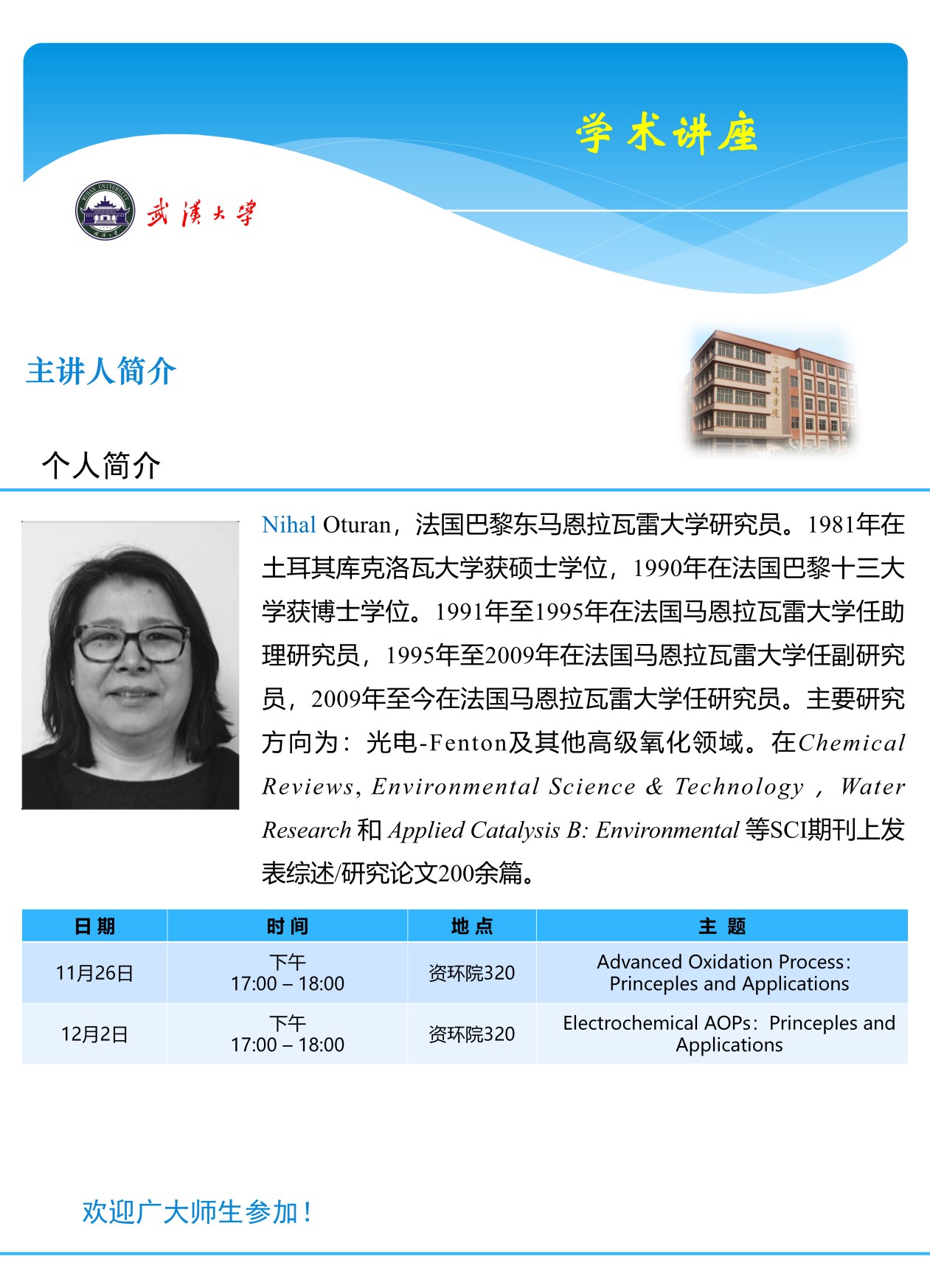 2021年11月26日至12月2日,应澳门美高梅 张晖教授的邀请,法国巴黎东马恩拉瓦雷大学研究员Nihal Oturan老师为学院本科生开展了2次高级氧化技术方面的课程讲座。