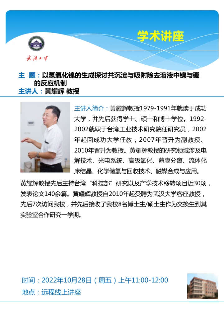【学术讲座】以氢氧化镍的生成探讨共沉淀与吸附除去溶液中镍与硼的反应机制