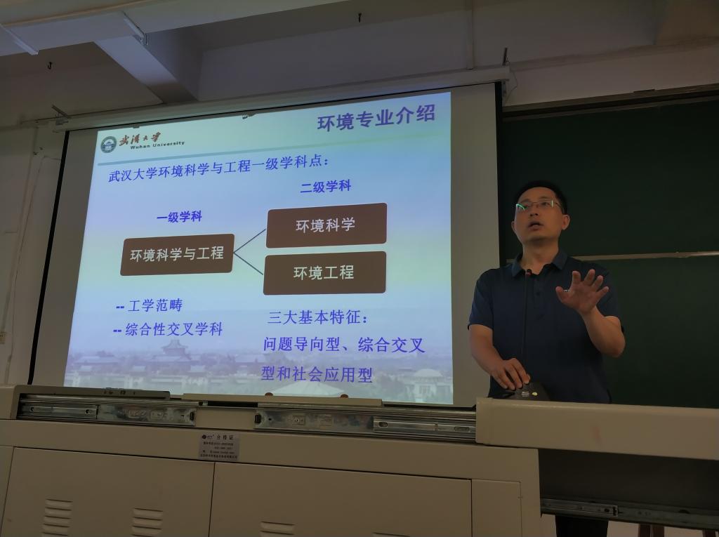 然后,进行专业介绍的是毛旭辉老师,他对环境科学和环境工程这两个专业进行了详细的区分和介绍,指明了环境科学专业可以概括为认识问题,而环境工程专业是解决问题。接着,毛旭辉教授从专业概况、师资队伍、代表性科研成果、本科生培养特点、校外实习实训基地、近三年本科就业情况、校友发展等方面进行了十分详细又全面的介绍。随后,邓红兵教授上台与学生交流自己的亲身经历以及对专业的认识和想法,帮助同学们加深对环境专业的理解。