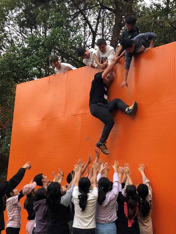 中国地质大学素质拓展基地的教练对老师与同学们的到来表示热烈欢迎。经过教练对培训情况的介绍以及对同学们的分组后,培训正式开始。整个培训由三个项目组成,同学们需仔细策划、互相配合才可完成。“毕业墙”中每组必须在无任何帮助的条件下徒手翻越4.2米的高墙,这十分考验同学们的配合与策划能力,但是在每一个人的不懈努力下,困难又变的那么渺小。壮实的同学主动当作“基石”,用坚实的臂膀撑起上行的同学,力量强大的同学首先翻墙,每一位同学都在尽着自己最大的力量,相互配合,相互支撑去完成。