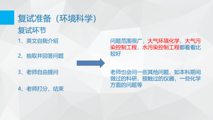 对于大家都很关心的考研问题,就读于北京大学环境科学与工程学院环境科学专业的郭鹏同学就自己的经验分享到:“考研就是优中选优。我在初试资料准备时的经验是,政治紧跟肖秀荣考研讲解,英语老老实实做真题,数学先过一遍教材、再结合练习《张宇1000题》、模拟卷。关于复试,其实就四步。英文自我介绍,抽取并回答问题,老师自由提问,最后老师打分。问题范围广,也会关注本科期间做过的科研,接触过的仪器,一些化学方面的问题。”细致耐心,面面俱到。
