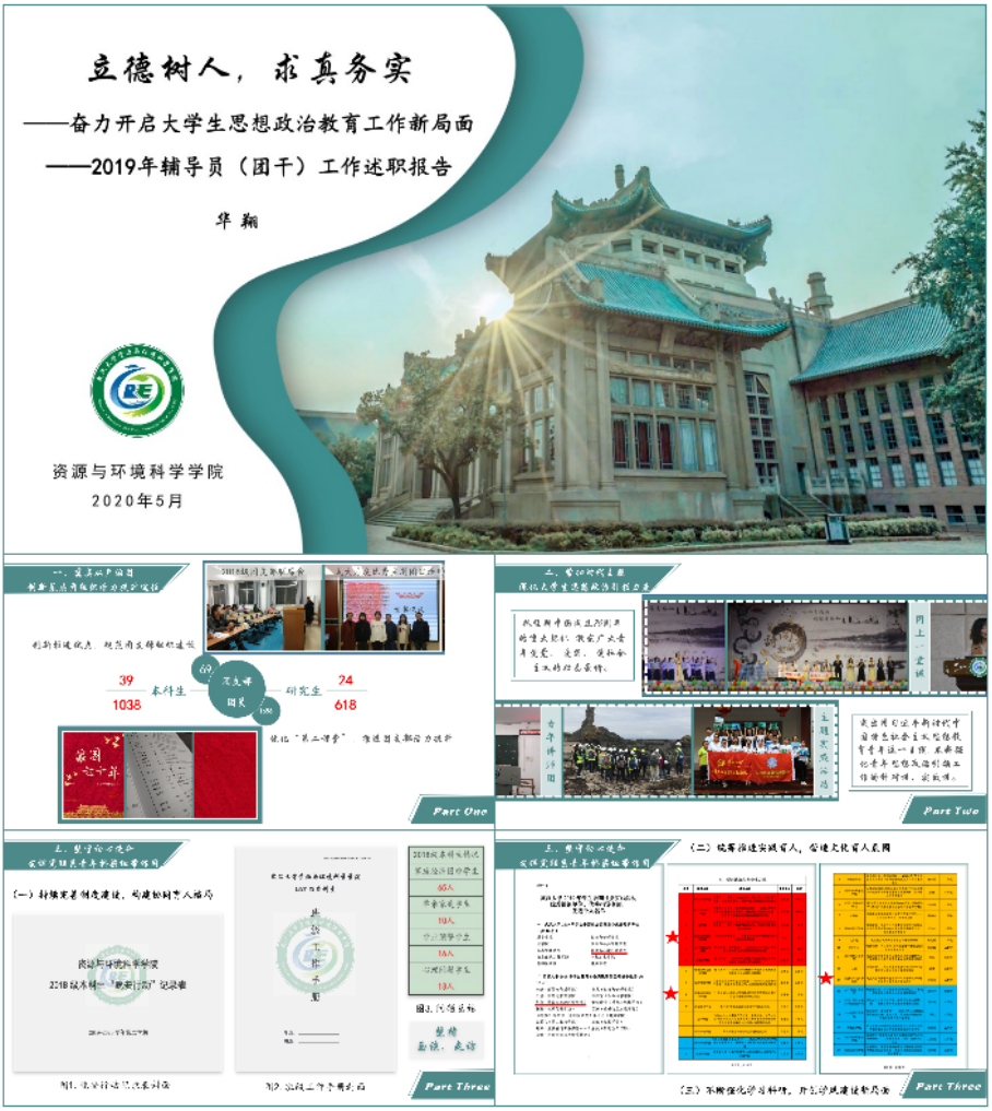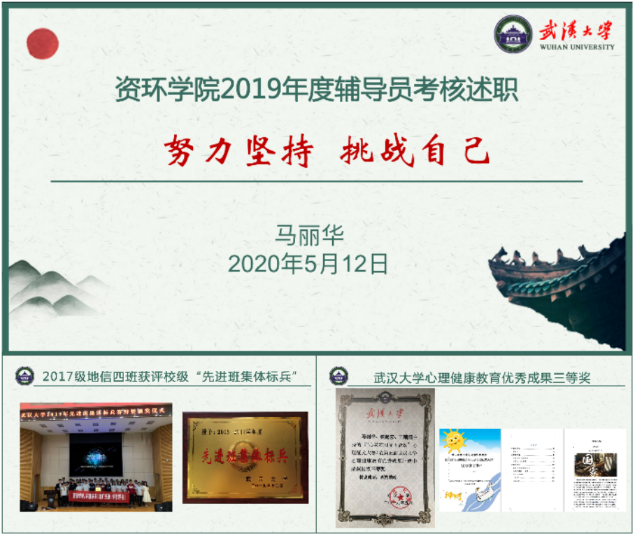 马丽华老师朴实的述职,让我们感受到2019年是她“战斗”的一年,也是收获的一年。马老师所承担的工作包括:本科2017级学生工作,学生心理健康教育工作,本科生党建工作,助学金、助学贷款、贫困认定工作,新疆籍少数民族学生工作,并协助分管副书记统筹学工办的各项工作。2019年上半年,马老师面临博士论文答辩,在紧迫繁复的博士毕业论文修改期间,有学生确诊患抑郁症,并有十几名学业预警的学生。马老师逐一和学生谈心谈话,加班熬夜完成工作,保持2017级各项年级事务工作正常推进。2017年下半年,马老师指导2017级地信四班参评全校先进班集体标兵。挑战重重,马老师没有言弃,她鼓励全班同学通过在台上展示的短短几分钟,体现出班级凝聚力和优良班风。好几个晚上,马老师一遍又一遍亲自带着学生彩排,和主要班干探讨上台的细节问题,不断修改学生的主讲稿,和打印店联系制作上台的道具。功夫不负有心人,“论文答辩攻坚战”圆满收官,“班集体标兵评选战”再一次以全校第四的好成绩获评校级先进班集体标兵。这两件事只是马老师全年工作的缩影,她认真对待每一个任务,努力挑战自己,并带领学生团队挑战他们自己,不拼尽全力,不说自己努力过。马老师热爱着自己的辅导员工作,把它作为一项事业来做,她表示将以执着拼搏的精神接续奋斗!