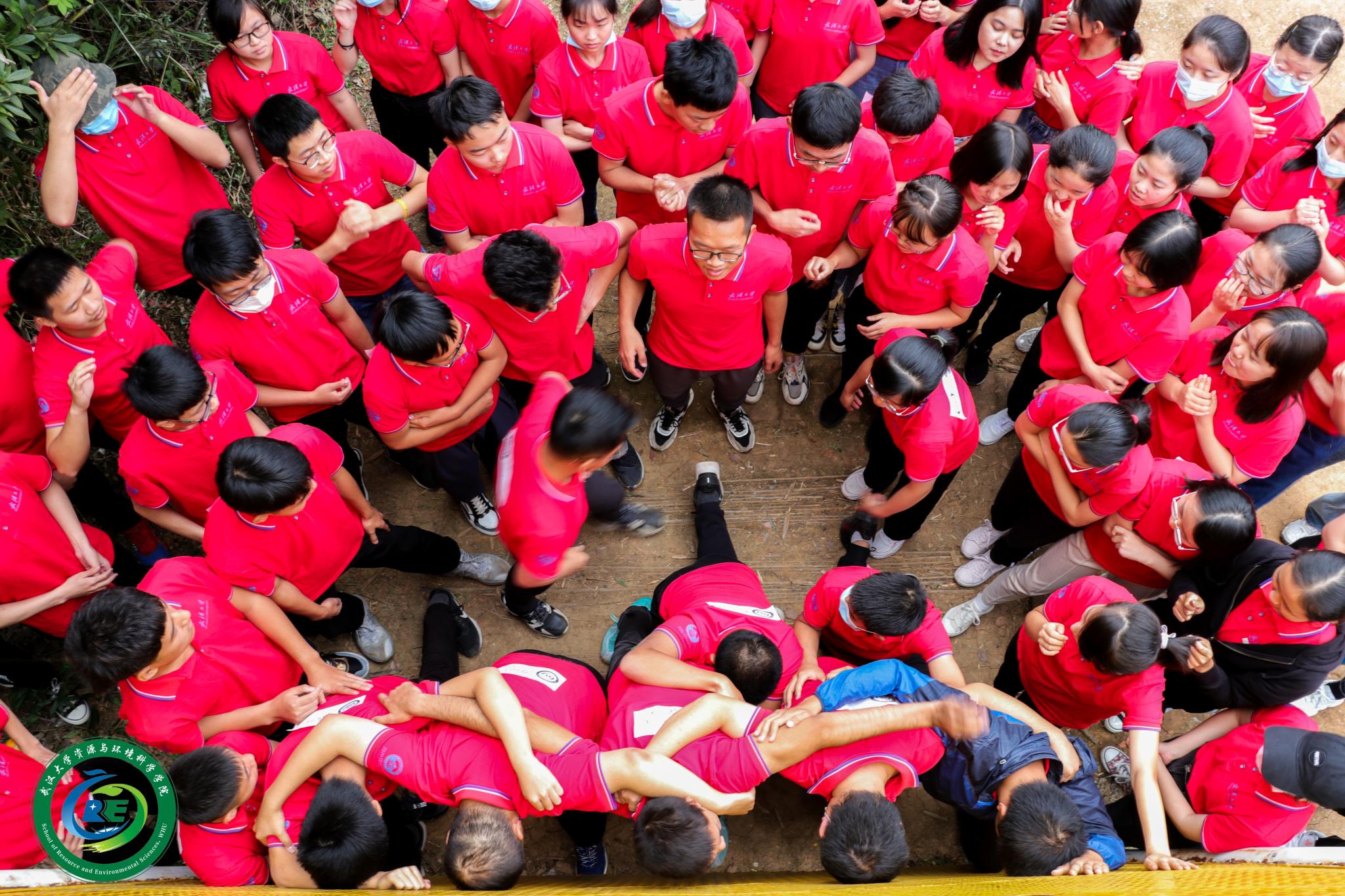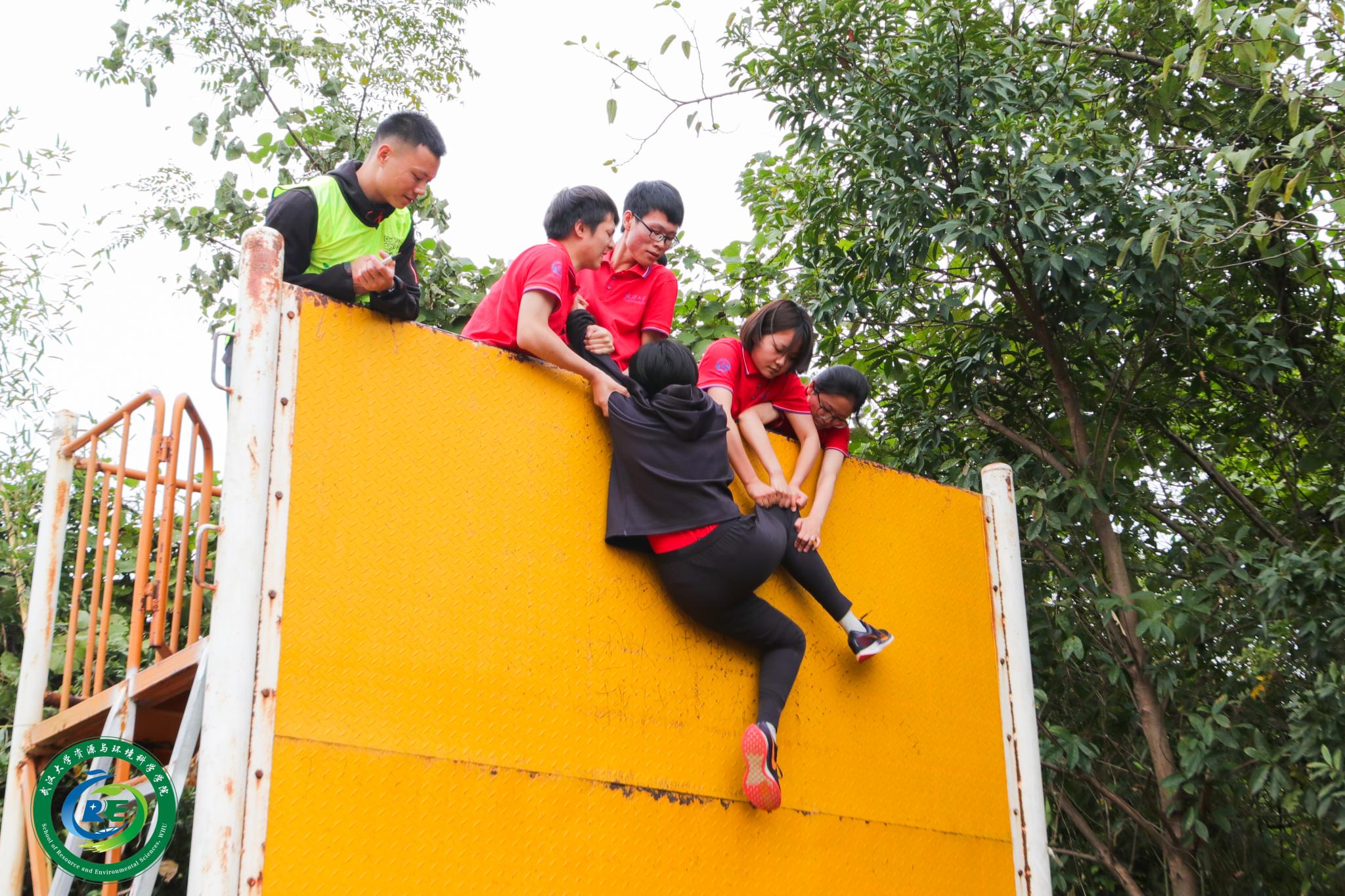 近四米的光滑高墙,如何才能翻越?三十人的团队要怎样安排才是合理高效的?无数的问题在倒计时开始前涌入脑海,又在开始瞬间被抛之脑后,每一个团队都迅速摸索出适合自己的方案,强健的同学们自愿在最下面一层担当最坚实的后盾,有力的同学则爬上顶端帮助后面的同学。汗湿了衣襟,热情与力量燃烧在内心。随着上去的同学越来越多,压力留给了在下面的同学,但是每一个团队都坚信“不抛弃不放弃”、“一个都不能少”,同学们通力合作,争取让每一位同学都有机会翻越高墙。