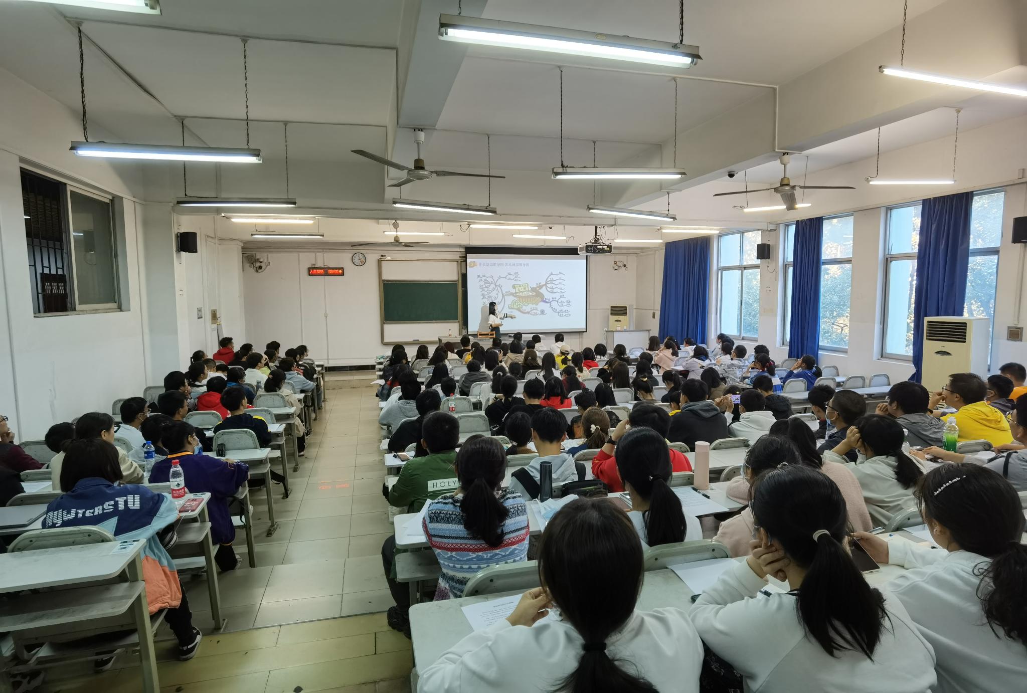 许彦淳的讲解主要分为“结构化思维”、“什么是思维导图、怎么画思维导图”和“如何用思维导图辅助学习”三大部分。她从简单概念入手,通过美国波音公司在设计波音747飞机的时使用思维导图的实例和大量她本人的手绘思维导图作品,让同学们对思维导图有了直观的印象。并以她的作品《七味茶》为例,向大家详细讲解了思维导图的具体绘制方法。