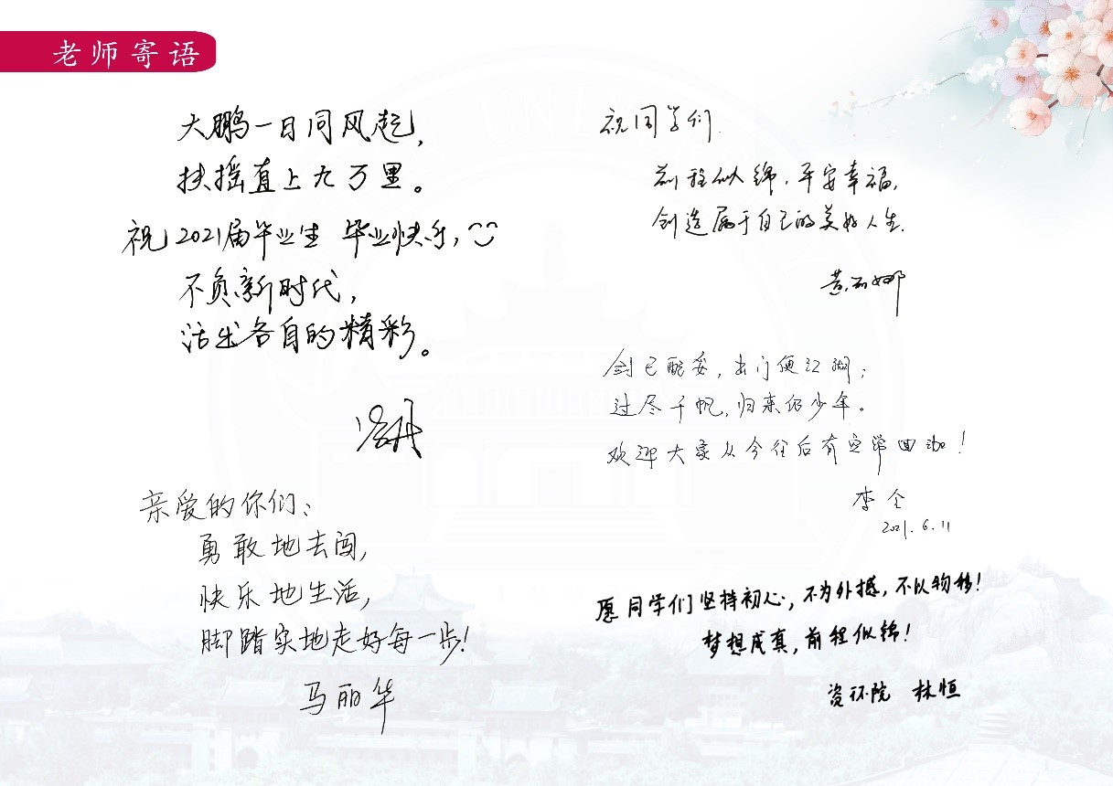 学院还印制了精美的毕业纪念册。纪念册中有学院领导、老师的毕业寄语,情深意重,满满祝福;各班的班级合影,展现出一个个优秀的集体,四年的时光,每一位同学都在集体中成长;大部分同学都手写了毕业寄语,有对大学的感怀,也有对未来的期许。学院也将毕业纪念册做成了电子相册分享给同学们,方便毕业生随时浏览。