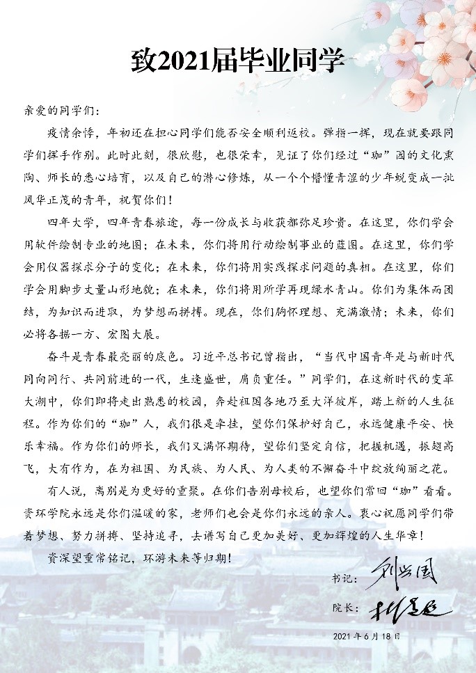 全校盛大的毕业典礼后,资环学院2021届本科毕业生带着学院的期待和祝福,离开了美丽的武大校园。一同带走的,还有学院赠给毕业生的毕业礼物,寄托了学院浓浓的情谊。