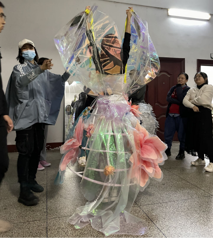 孙艳瑜: 今年有很多很优秀很有才华的大一同学们的加入,他们提出了一些非常有创意性的底稿,但是在制作过程中会出现制作很麻烦,难以将作品完整的呈现,或者说以我们的能力无法做到完美的问题。在遇到造型或者道具没有办法制作出来的时候,我们就会开一个小会议,共同探讨怎么去解决这个问题,选择用其他道具代替或是换一个思路替换一些元素去重新展示这套衣服。