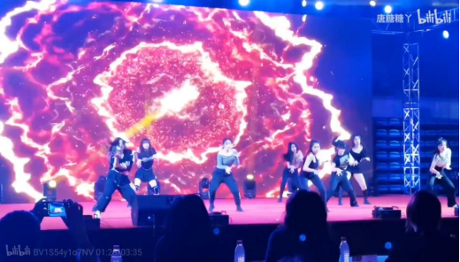 随着视频进入尾声,全场灯光暗下,在台下观众的满切期待中,舞曲响起,屏幕闪耀,紫光漫洒队员,全场聚焦于舞台中心。在变化多彩的灯光下,队员们黑与白的身影随着音乐节拍而舞动,十人的走位整齐而变幻,动作干净有力,卡点精确,充满活力与动感。