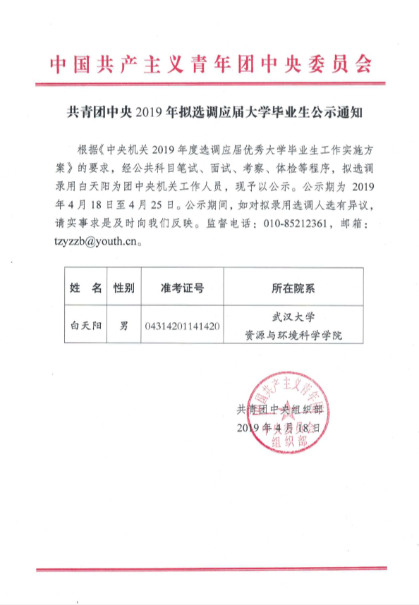 澳门美高梅 关于共青团中央2019拟选调应届大学毕业生公示通知