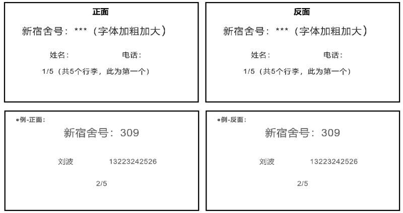 (1)学校为每人免费提供5个编织袋,为每间宿舍配发一套记号笔(6月20日起可在宿管处领取)用于寄存行李的打包。同学们务必在编织袋外面的正反两面用记号笔醒目标记回迁后的宿舍号及相关信息(如图1)