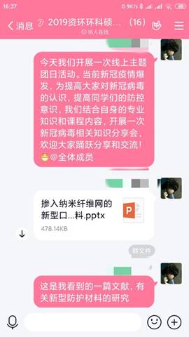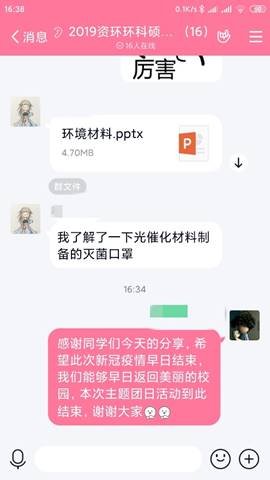 疫情期间,学校及时组织开展网课学习,老师们远程开课,同学们得以正常进行学习。作为环境科学专业的硕士研究生,同学们大多会涉及到材料方面的研究。因此,我们充分发扬了专业特长,结合近期课程内容,查阅文献,查找资料,并进行总结,为此次主题团会做了充足的准备。团会开始后,同学们积极分享自己所总结的资料。