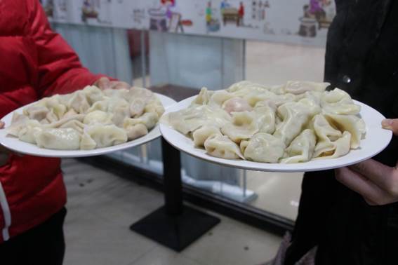 包着饺子,聊着天,虽然各地风俗文化有差异,但不变的的是那份家的温暖。不一会,盘子里已经装满了各式各样的饺子,有“金元宝型”、“月亮型”、“太阳型”的,现场热闹极了。包完下锅后,热气腾腾的饺子被端上了餐桌,配上各式的调料,大家都吃得酣畅淋漓,心满意足。