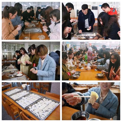 活动一开始,大家热情高涨,积极参与,配合食堂师傅将各种材料都准备齐全,认真学习包饺子的要领,多少皮配多少馅。活动正式开始,同学们大显身手,包得像模像样,包出来的饺子也各有特色,“金元宝型”、“包子型”、“小老鼠型”甚至“太阳型”,引起现场笑声不断。包着饺子,聊着天,各地风俗文化虽异,但不变的的是那份家的温暖。在异乡的冬天,和朋友们齐聚一堂包回饺子是不是也稍稍慰藉了那思乡的心切呢?