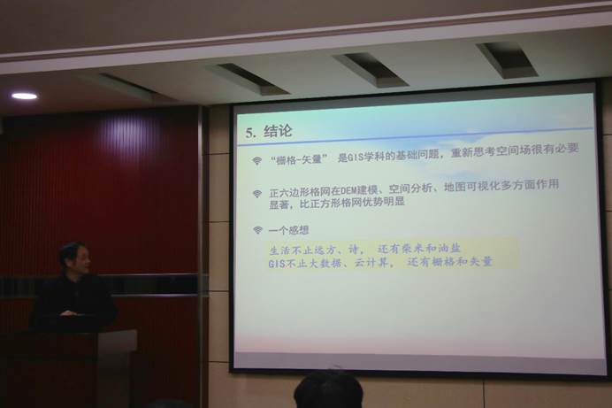 最后,他总结道:栅矢一体化是GIS学科的基础问题,将物理学中的场模型引入,重新思考空间场很有必要。正六边形格网在DEM建模、空间分析、地图可视化多方面比正方形格网优势明显,我们不仅要关注GIS的大数据、云计算等方向,关注栅格和矢量同样重要。