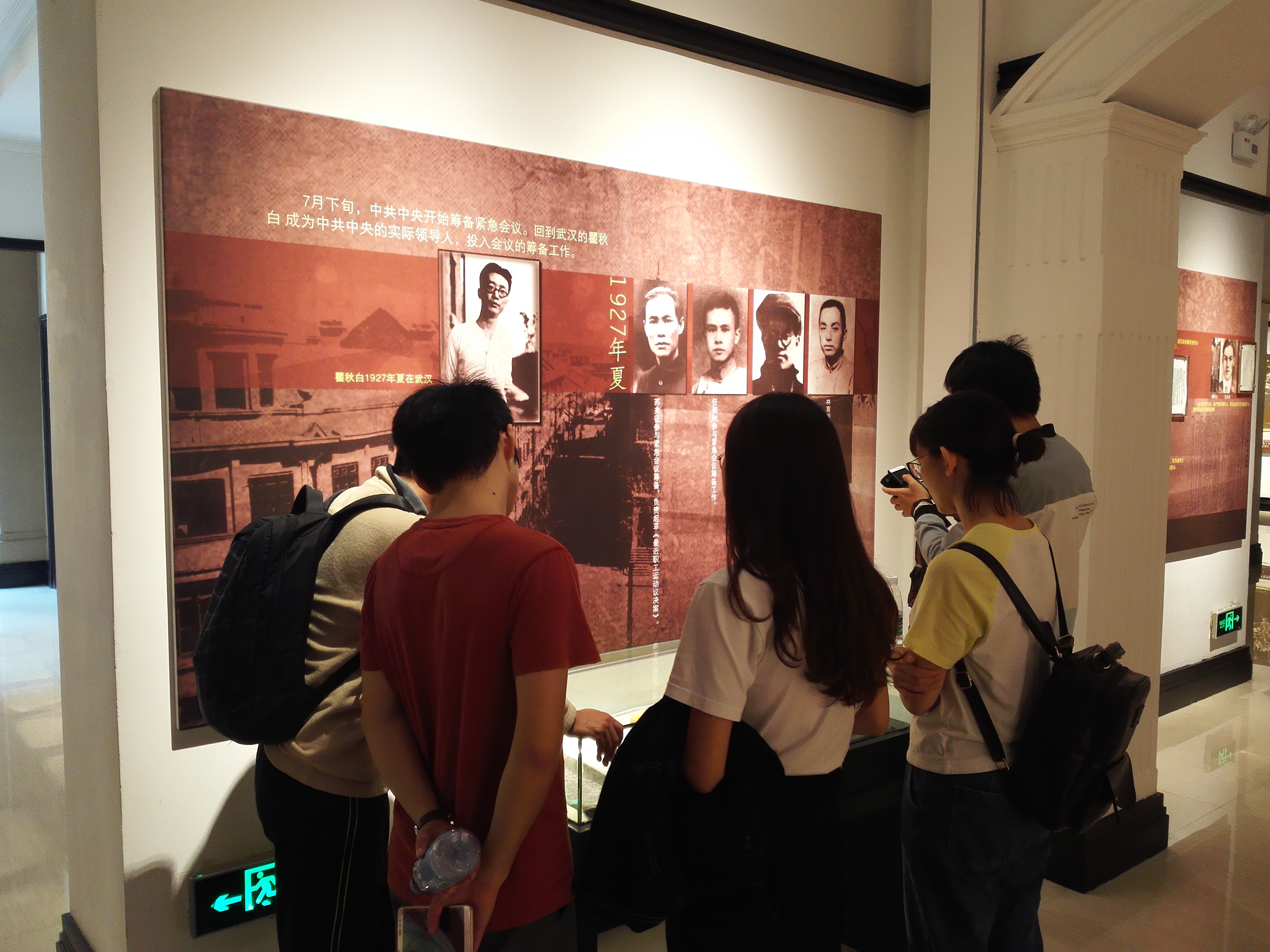 最后,随着同志们更加高涨的学习热情,全体支部全员来到了位于鄱阳湖路139号的八七会议会址纪念馆,八七会议会址为一栋三层的西式楼房,建于1920年,原是英国人建造的公寓,国民革命军北伐占领武汉后并建立武汉国民政府,二楼则是苏联援华农业顾问洛卓莫夫的住处。1978年8月7日,八七会议会址恢复原貌并建立纪念馆,正式对外开放。1980年5月邓小平同志在北京题写馆名“八七会议会址”。一楼举办有《八七会议历史陈列》,二楼为会场复原陈列以及《毛泽东在湖北》大型图片展。一楼辅助陈列分为三个部分,即“风云突变”、“重大转折”、“星火燎原”,展出的300多件文物、照片和珍贵历史资料,再现了八七会议的历史,讴歌中国共产党不畏艰险、力挽狂澜、挽救中国革命于危难之中的光辉历史。其中,会议通过的《告全党党员书》等重要文件的复印件和全部会议参加者的照片及其生平简介、八七会议记录及其决议案、会议代表瞿秋白等人用过的物品、李维汉的亲笔信函以及邓小平回忆八七会议的录音等,均是纪念馆的特色藏品。在纪念馆出口处,设置了一块巨大的触摸屏,屏幕上堆叠着数以千计的抗日相关照片、绘画作品等,可以通过轻轻点击屏幕,详细观看展品,并为作品点赞。同学们饶有兴趣地聚集在屏幕前面,更加认真地观看感兴趣的影像资料,并满怀敬意地点赞,小小的一个举动,更感受到了同志们对于党史、党建的求知欲望和对革命先辈的敬仰之情。