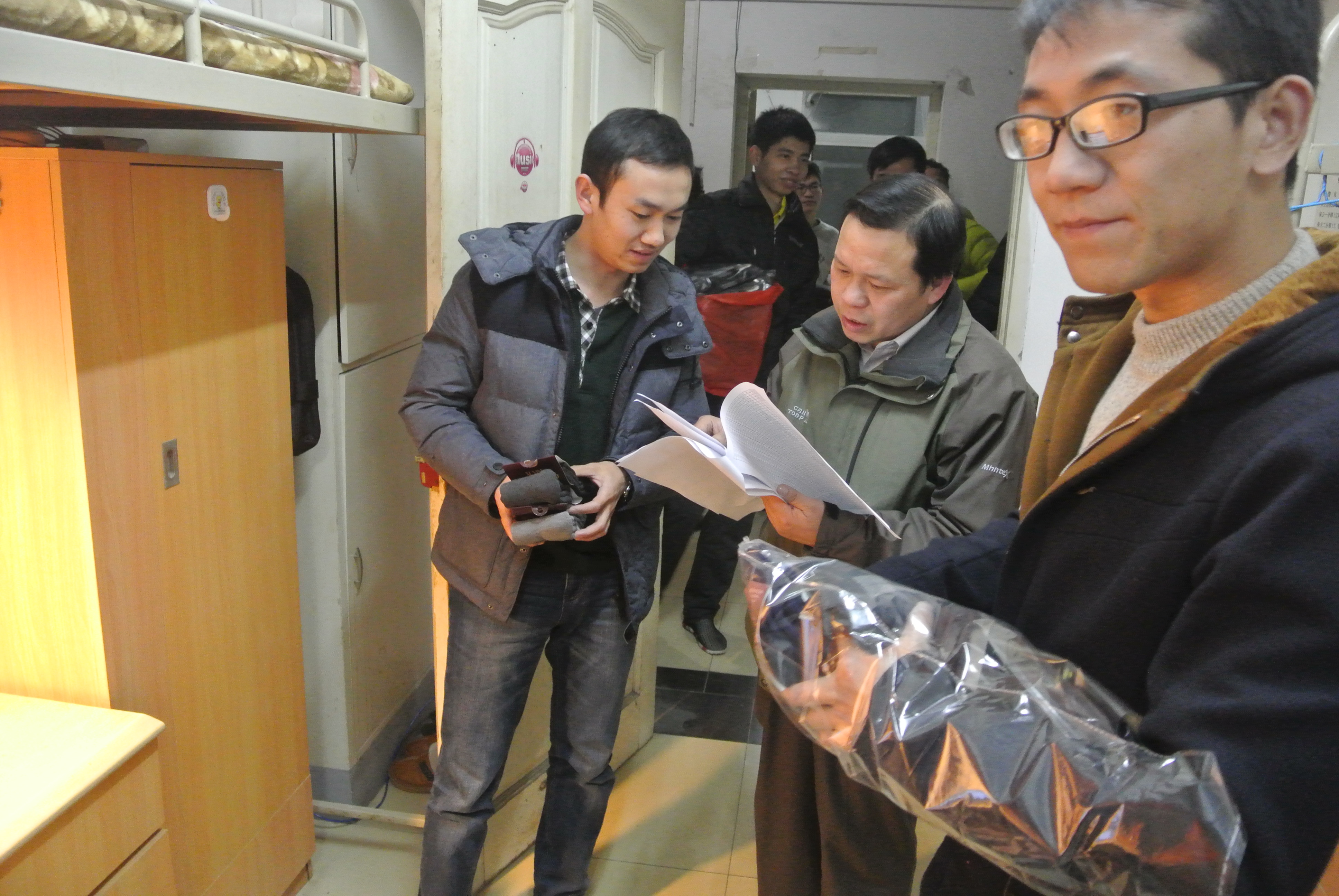 这是学院连续第四年冬日到研究生宿舍、实验室开展“送温暖·送平安”主题活动。通过此类活动,以期近距离和研究生同学交流沟通,了解他们的所思所想,更好地为他们的成长发展服务。同时,学院也希望各位同学切实增强安全防范意识,养成安全用电习惯,防止和避免各类安全事故发生。腊月的寒风在江城挥之不去,同学们积极的态度和会心的微笑就是对本次活动最好的回应,在此也感谢学院研究生会各位工作人员的辛勤付出!