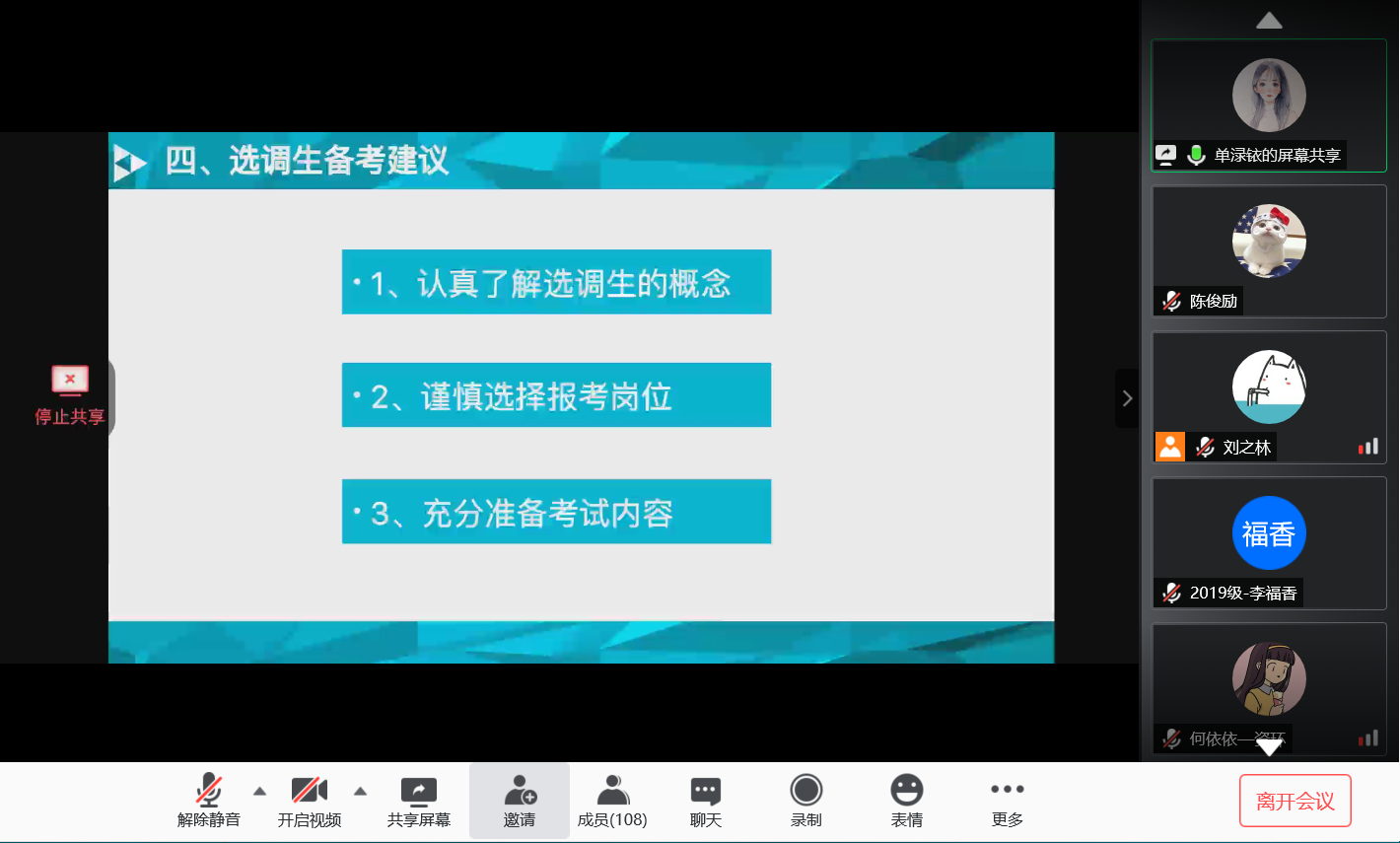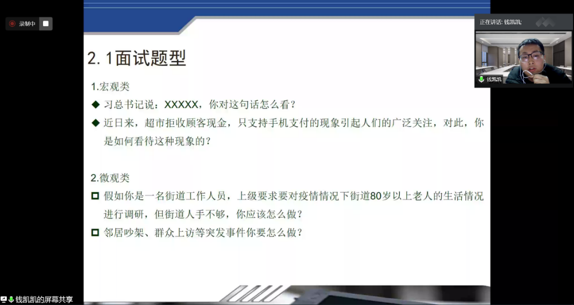 单渌铱从浙江省选调生报考条件、流程、笔试、面试、个人工作内容、选调生备考建议几个方面进行了分享。首先,单渌铱着重介绍了确定人选、任职定级、培养锻炼相关政策:浙江省面试结束后,按照“首轮排名,二轮双选”的方式确定拟选调人选;任职定级上选调生录用后实行为期一年的试用期;选调生接受专门培训后,安排到基层锻炼。关于笔试,单渌铱介绍了2020年浙江省选调生笔试和面试的题型。最后,单渌铱强调笔试一定要多刷题,面试可根据自己情况酌情报班并且加强练习,同时要注意多关心时事政治,品读习近平语录,提升思想觉悟,答题时与时事联系在一起。