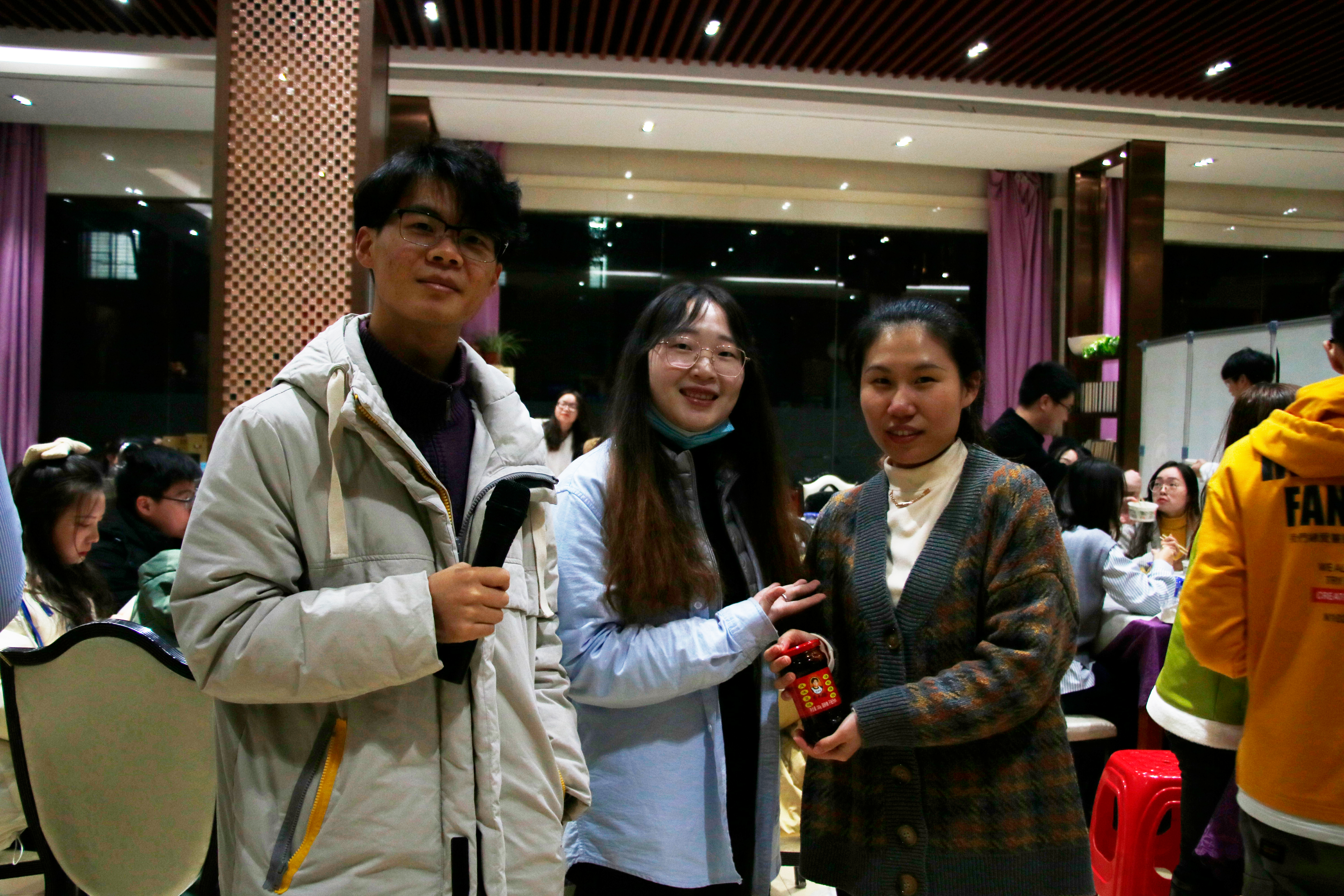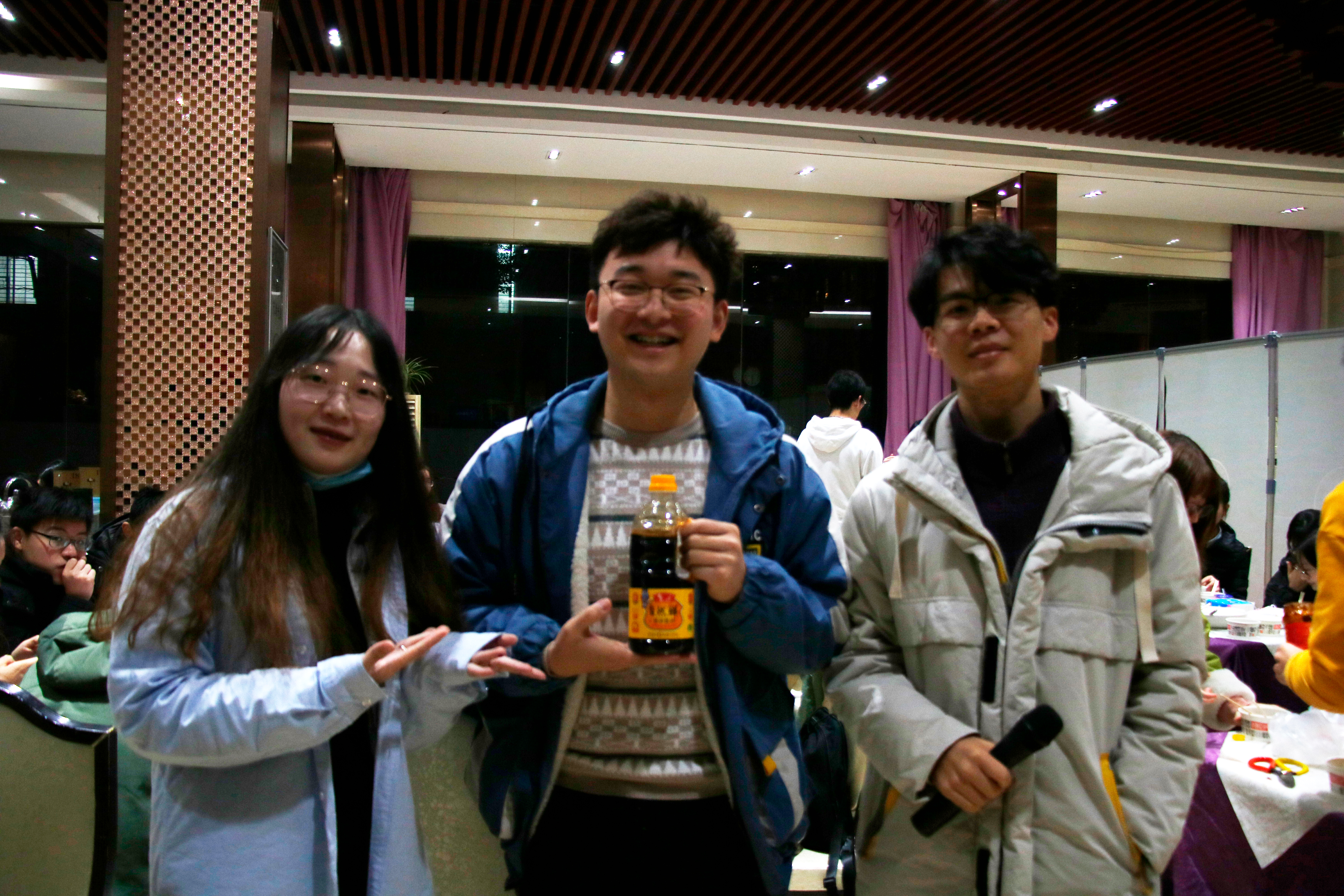 随后,研会主席团在众多饺子中评出趣味饺子冠军和幸运饺子冠军,获奖的同学高兴地上台领奖。在等待煮饺子间隙,大家一起做小游戏。研会部员芳芳还为大家清场一曲。