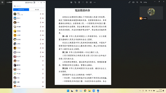 研究生各班以多样性形式参与到宪法学习宣传活动中来。比如,2022级地理学硕士班以腾讯会议的方式组织同学共同学习宪法晨读内容,并鼓励同学们在空余时间自行广泛而深入地学习宪法、民法典、教育法律法规和未成年人保护、爱国主义教育等相关法律知识。2023级土地资源管理硕士班集中观看、学习了宪法宣传片《感受宪法的力量》,并以团支书带领诵读宪法部分条款的方式,推动学生深入学习宣传宪法、习近平法治思想以及重要校纪校规。2022级地图制图学与地理信息工程硕士班同学以宪法晨读为基础,利用网络资源,积极分享自己的宪法学习心得,形成良好的学习氛围。