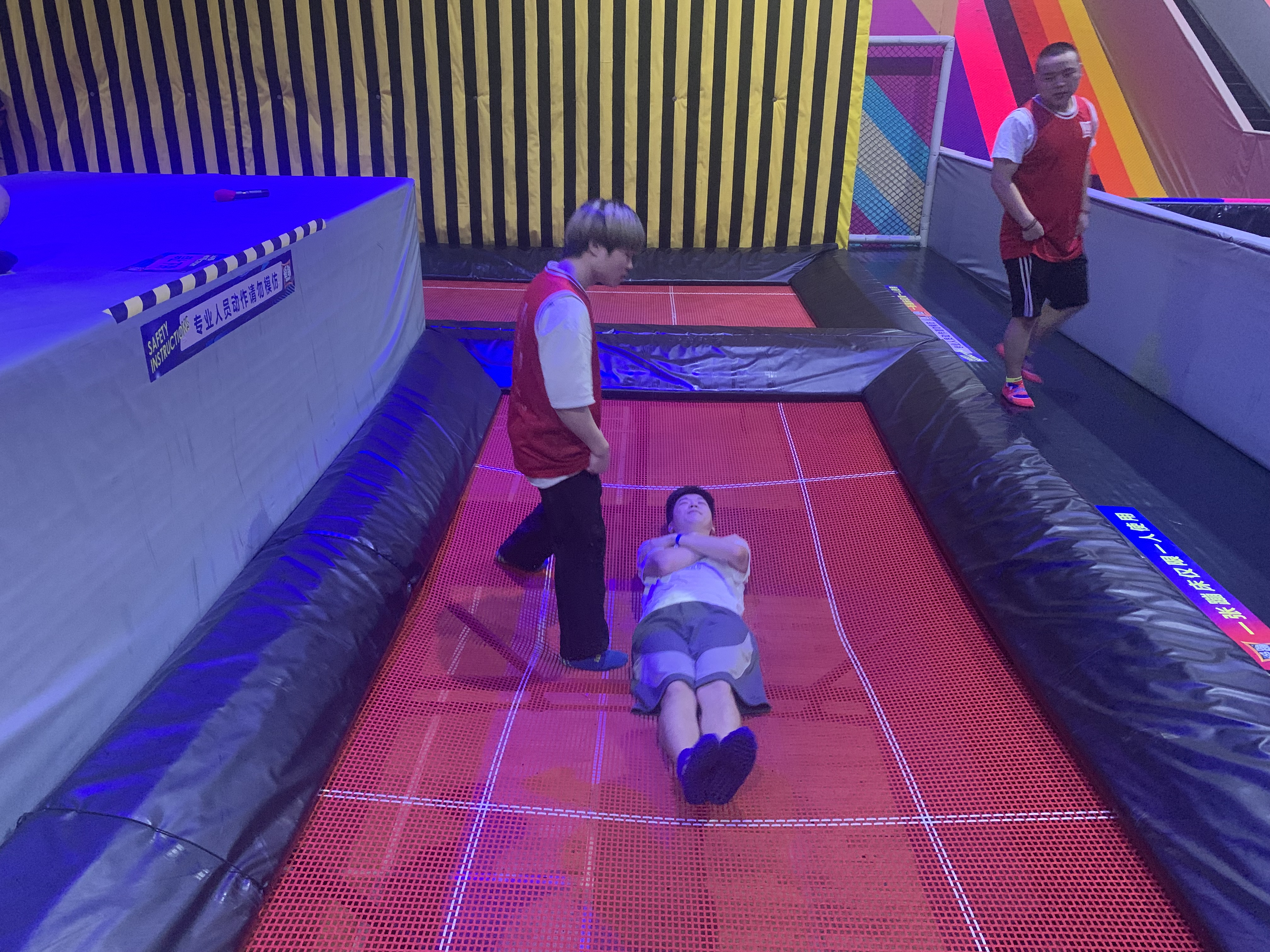 在热身运动部分教练现场教学蹦床的正确打开方式,带领大家进行充分热身,确保安全运动减压,杜绝意外发生。坐弹比拼赛中,同学们学习跪弹和坐弹的标准动作并分组进行了激烈比拼。碰撞球大赛中各队选出优秀队员进行撞球对抗,不限方式击倒对手,在30s倒计时结束前留在圈内的同学获胜。游戏过程中,同学守株待兔、以静制动在最后10秒发起猛烈进攻成功占领核心位置,献出精彩的策略对抗。最后的自由环节,同学们挑战起了最精彩最刺激的90度滑梯和滑草项目,在高速下落的过程释放自我。另外还有娱乐休闲的滑梯、蹦床投篮或扣篮、溜索、攀岩、独木桥争夺,与教练的协同蹦床表演等项目让人在逃脱引力的刺激之余体会到与休闲娱乐的美好。