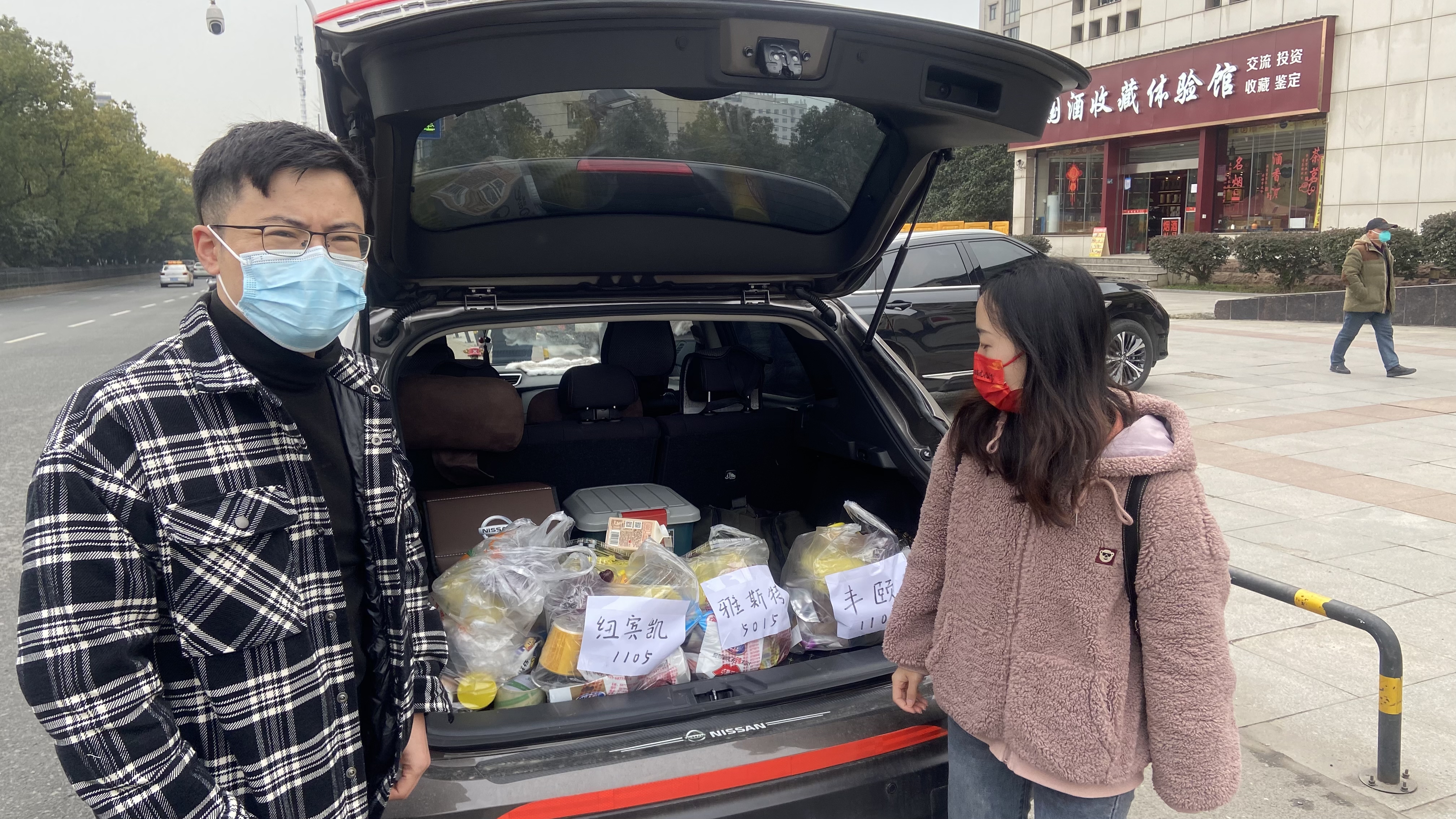 研究生党支部书记联席会成员在辅导员老师的带领下驱车前往校外隔离地点,给正在隔离的同学送去生活物资。