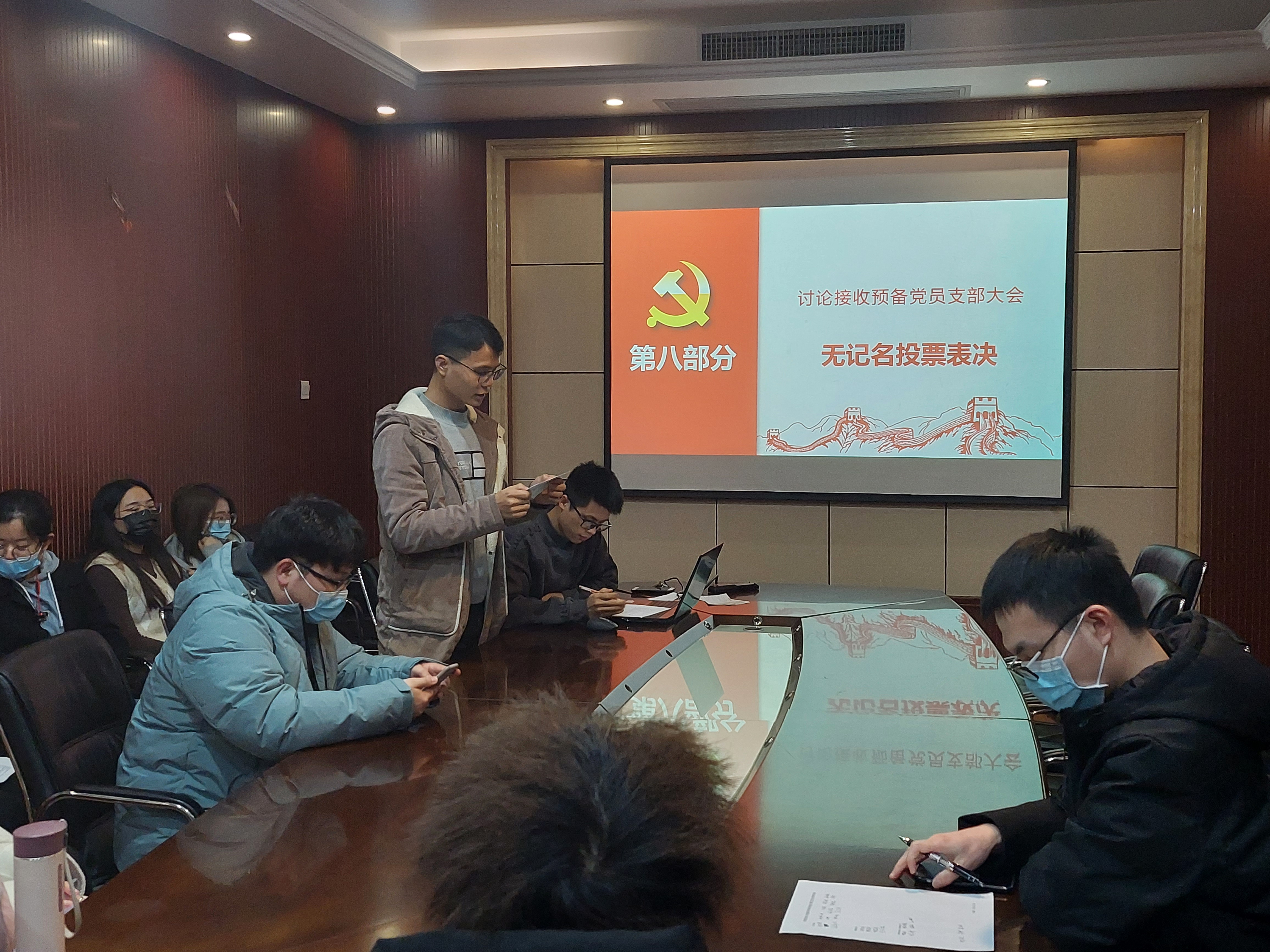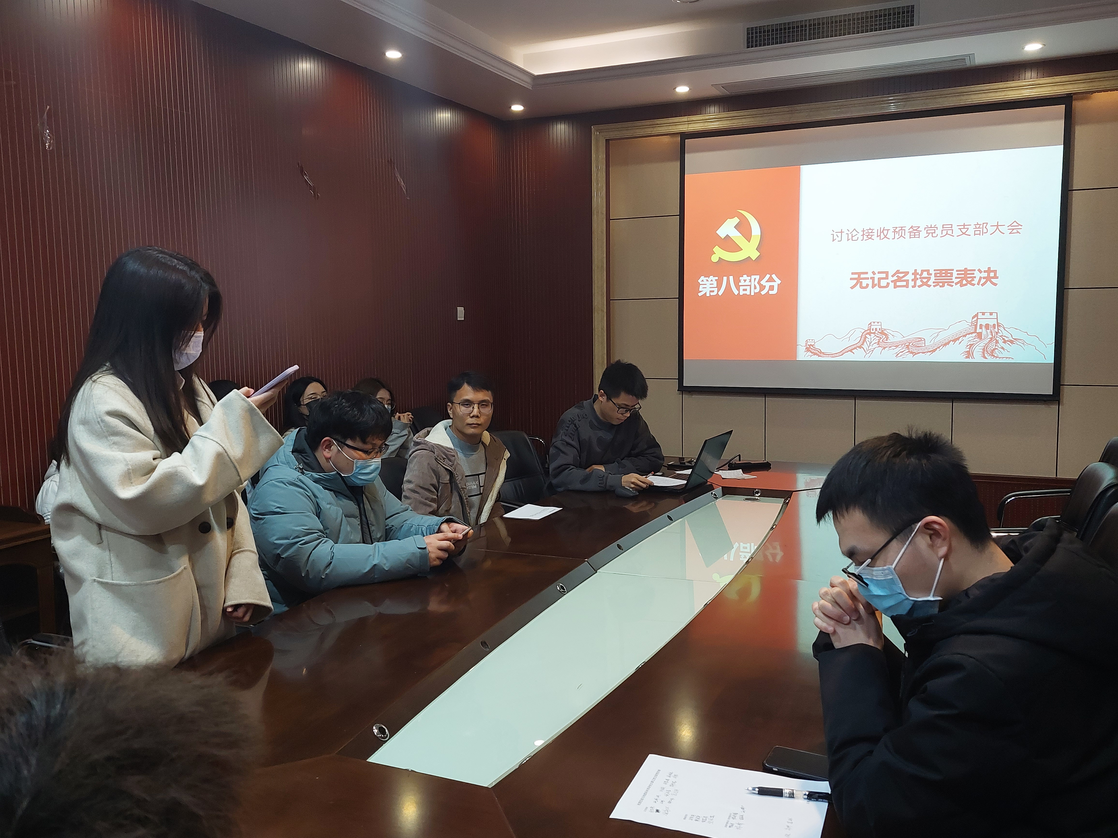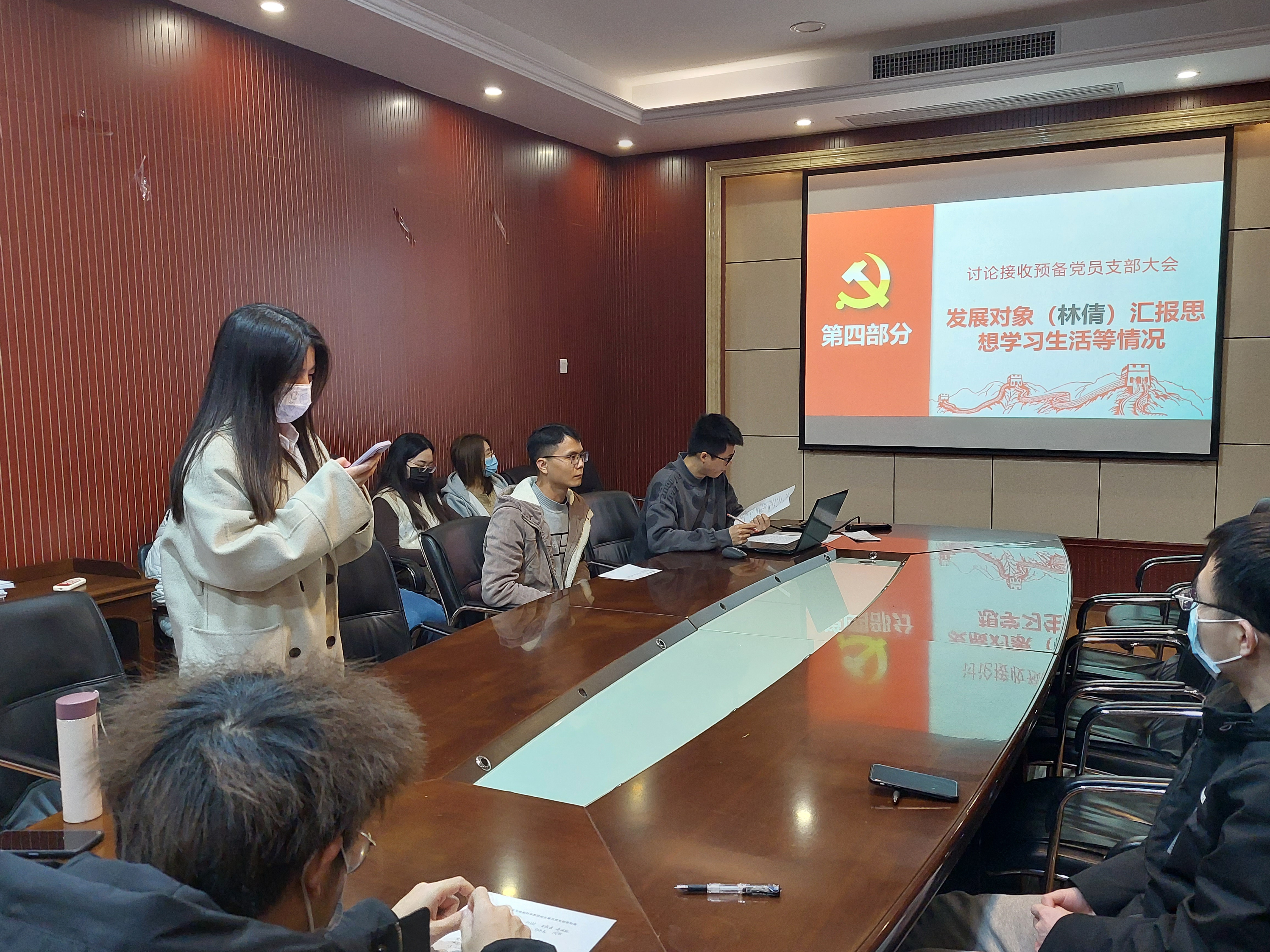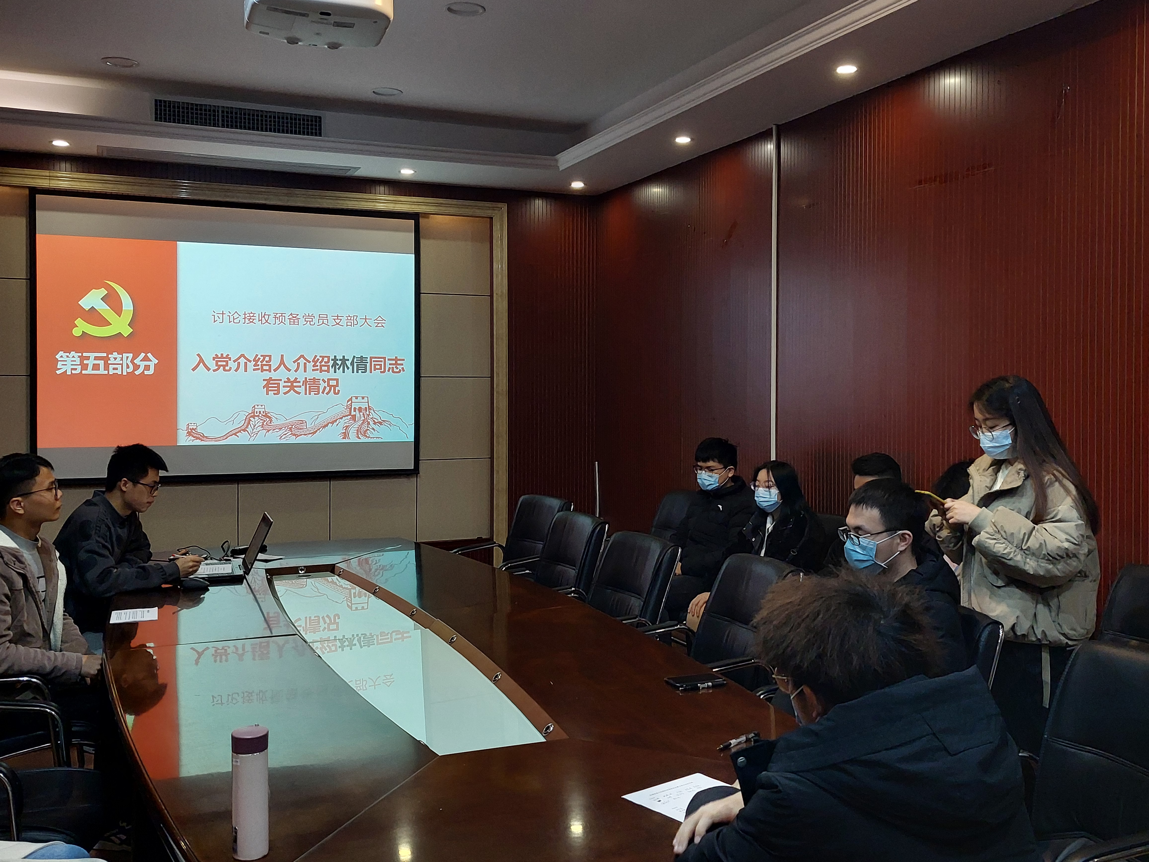 会议开始,由支部书记余华飞同志对本次会议的基本内容进行了介绍,主要为讨论林倩同志与孔博同志的预备党员接收。首先,林倩同志与孔博同志向组织汇报了自己在预备期间的工作学习情况,阐述了个人思想认识等方面的进步,表达了自身的发展意愿。