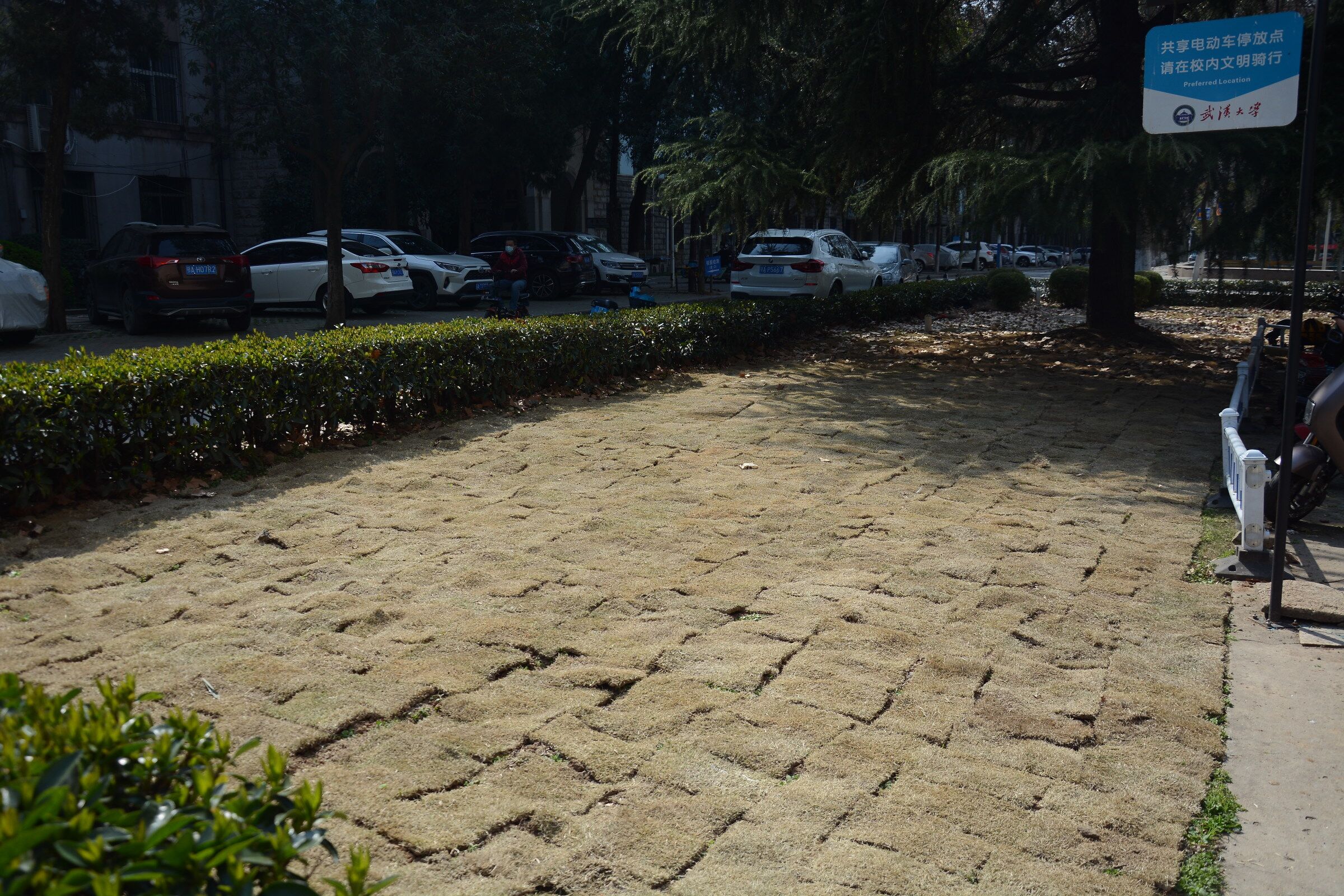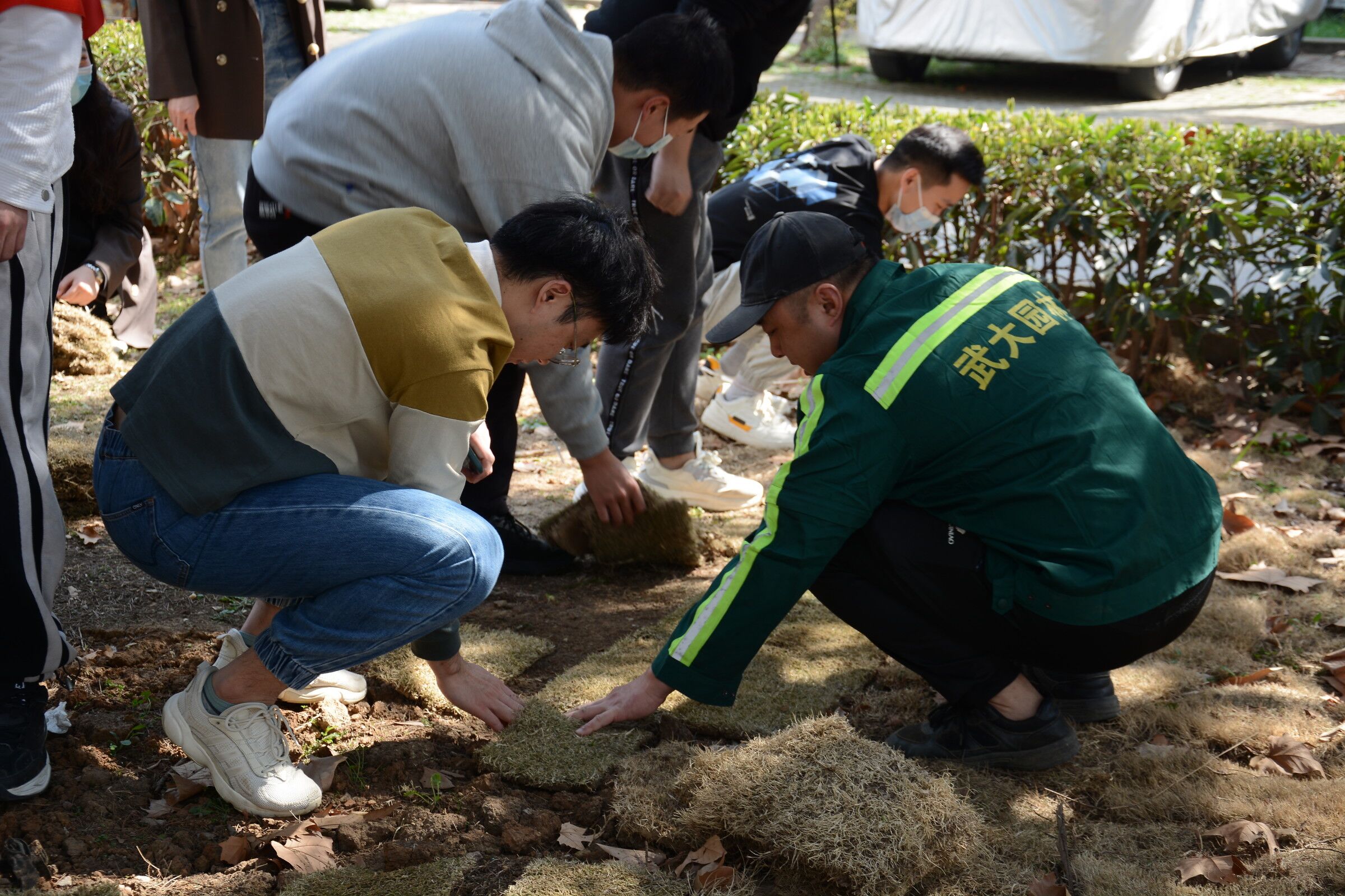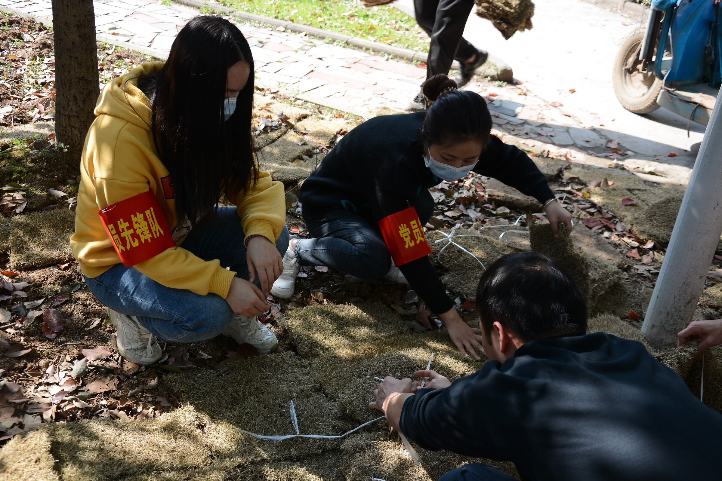 信息学部绿化环卫队的大力支持,该单位为活动提供了绿化草皮。活动过程中,党员同志们分工明确,有条不紊,有的搬运草皮,有的拆解草皮捆绑带,有的化身为“拼图大师”,在土地上铺植草皮,为大地穿上绿色新衣,大家热情洋溢,干劲十足,以饱满的活力投入到志愿服务活动中,现场一派紧张忙碌的劳动景象。