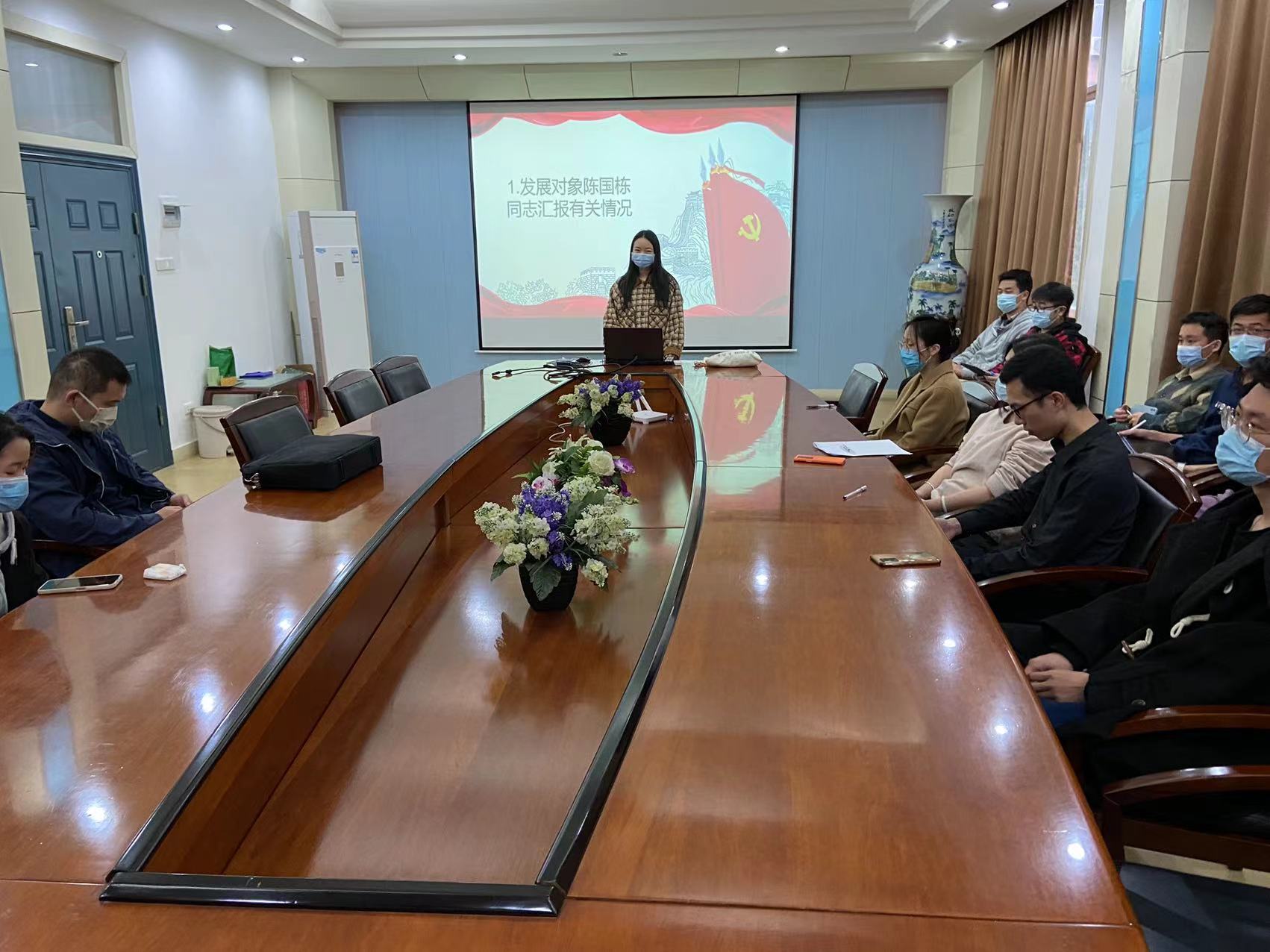 会议开始,焦丹同志简要介绍了本次会议的流程与事项,向大家汇报了本次会议应到正式党员22人,预备党员8人,实到正式党员21人,预备党员7人,符合会议程序,宣布本次支部大会可以召开。