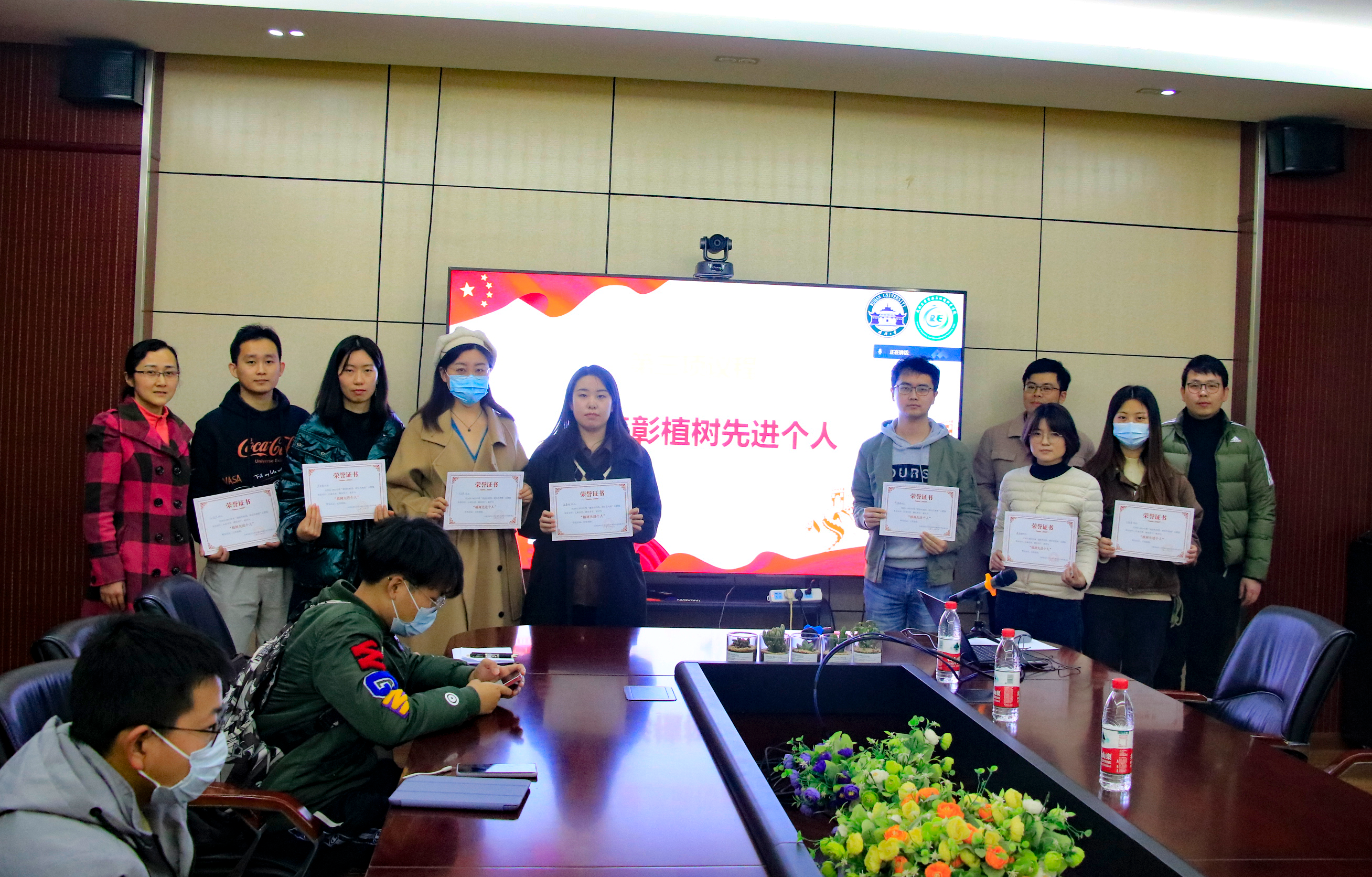 表彰植树先进个人环节,回顾了三月份以来,八个研究生党支部共计80余人积极投入到学校的志愿植树活动的过程,涌现出了一批先进典型。由学院党委副书记马丽华和学院研究生辅导员李韩为植树先进个人颁发证书并合影留念。