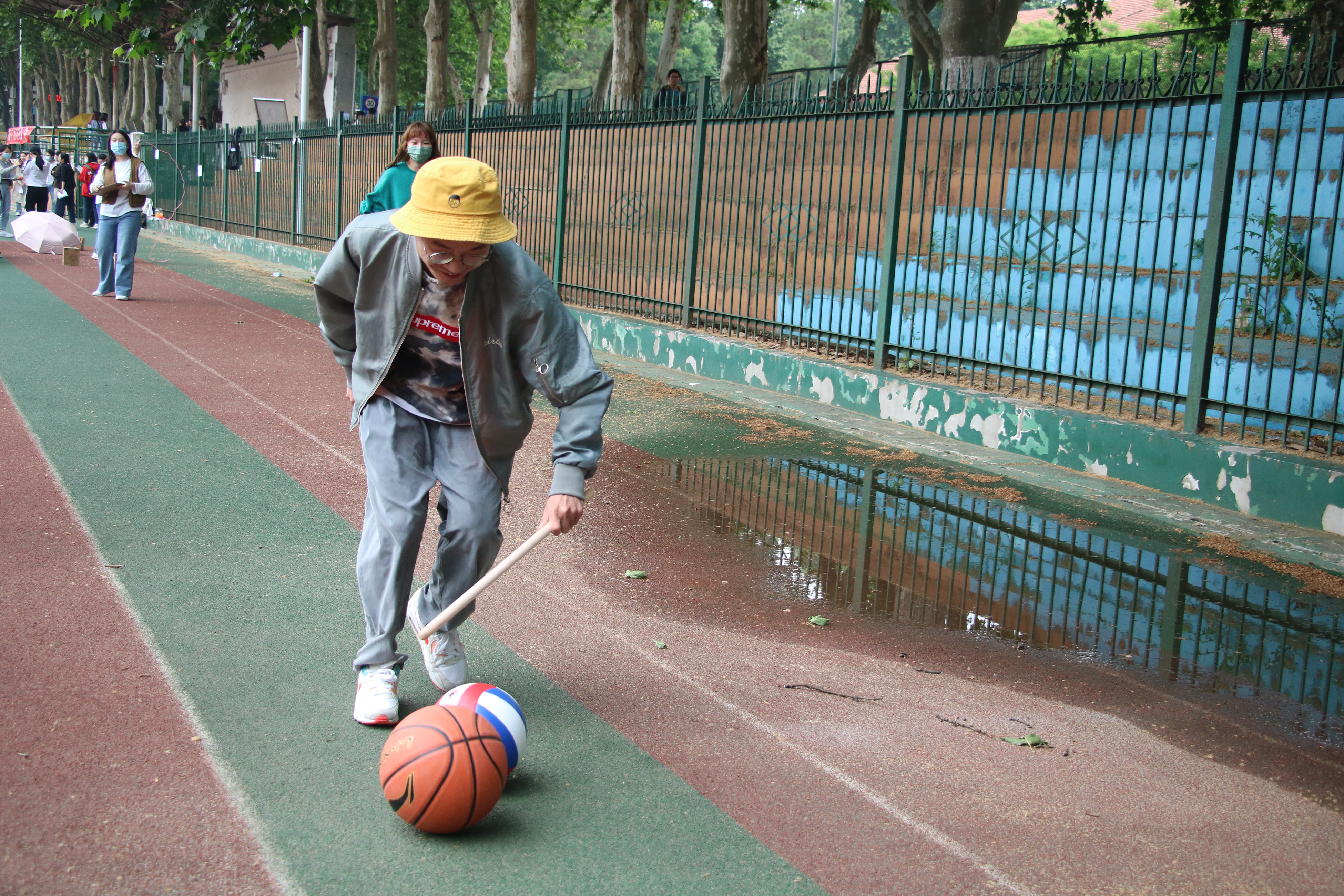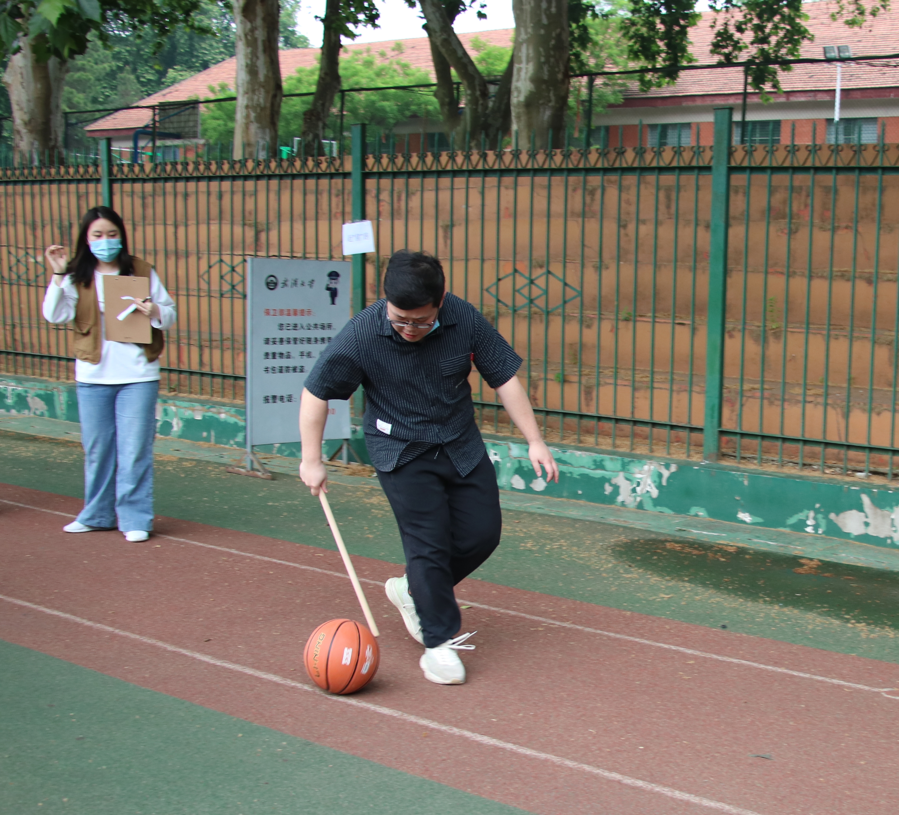 在该项目中,一根木棍滚一个球容易,那两个球呢?挑战了个人的运球水平!