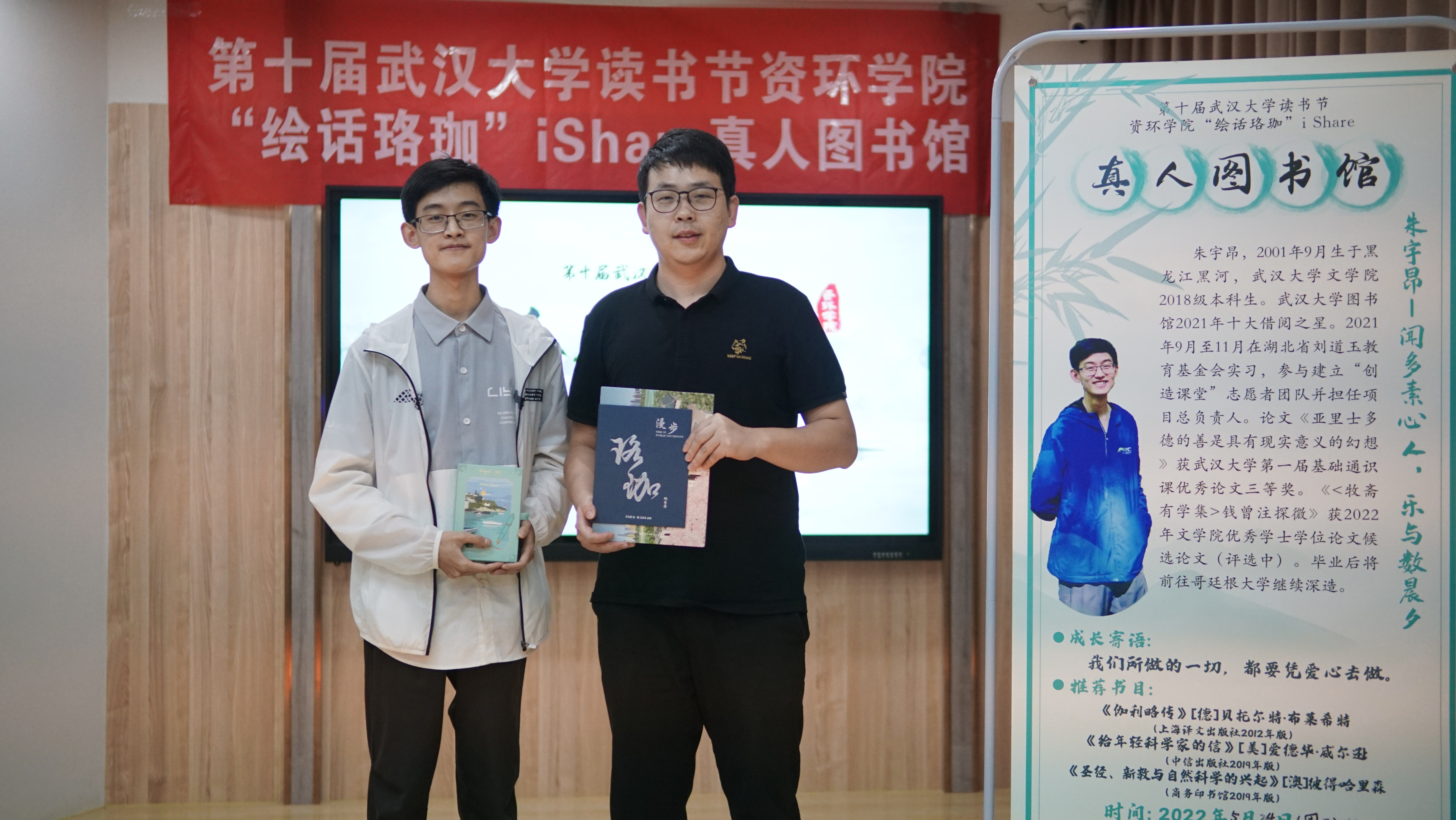 本期真人图书馆在分享人和借阅人的互问互答中,有序进行。第一部分——夙夜强学:朱宇昂介绍了家庭环境对个人性格的影响,中学时期的阅读经历使他养成了对社会现实问题的敏感度;第二部分——交贤方汲汲,友直每偲偲:朱宇昂分享了在武大四年的求学经历,讲到了于亭老师“实事求是、无征不信”的敦朴刚毅,张箭飞老师沟通文理的学术视野与想象力。仰之弥高,钻之弥坚,他们的渊博知识和人格魅力对自己走上学术道路起到了重要的引领和示范作用;